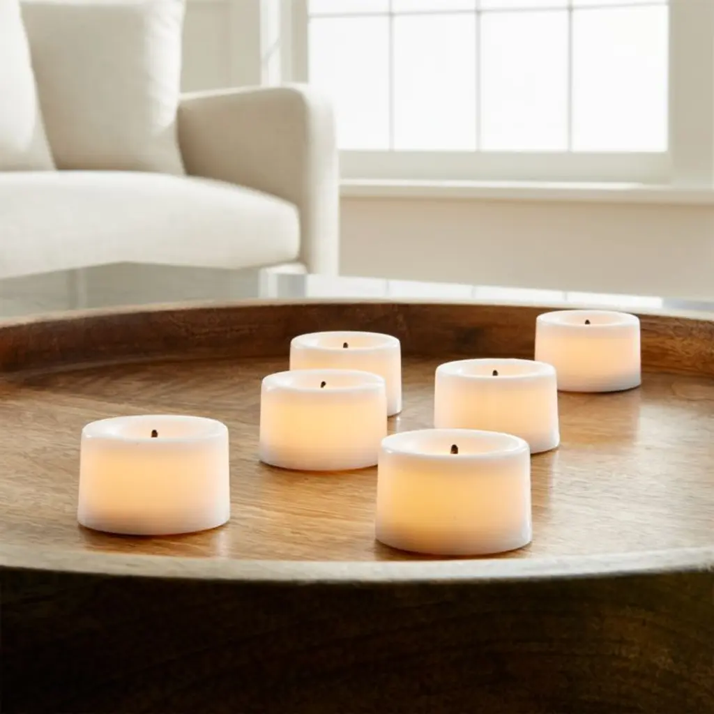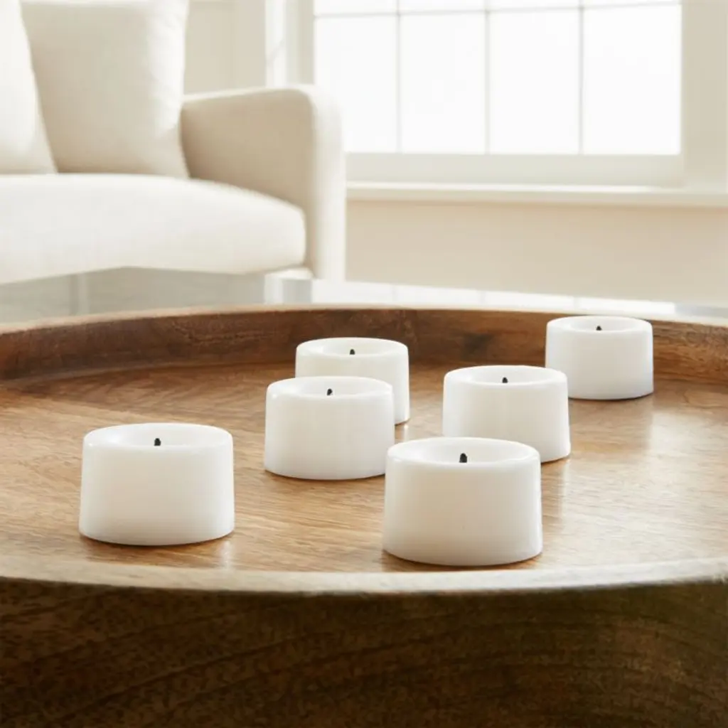 Flameless wax tealights glow with a realistic flicker, creating worry-free mood lighting. Scatter our diminutive candles across mantels or place in any of our tealight holders for hours of warm candlelight without dealing with matches, hot wax and open flames. Made of actual wax, this set of six tealights has an authentic look and glow, enhanced by the flickering light. These little flameless tealight candles are particularly perfect to use in homes with children and pets or to place in enclosed vessels such as our white ceramic houses.