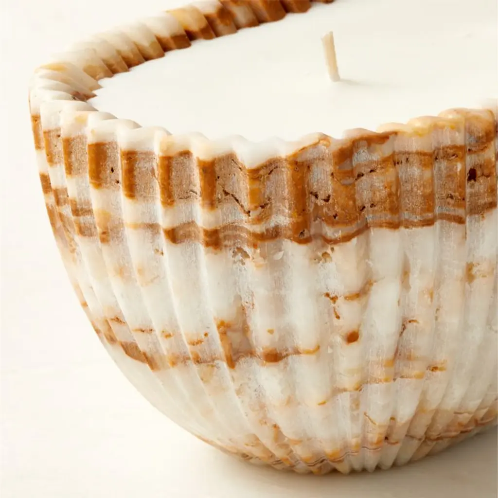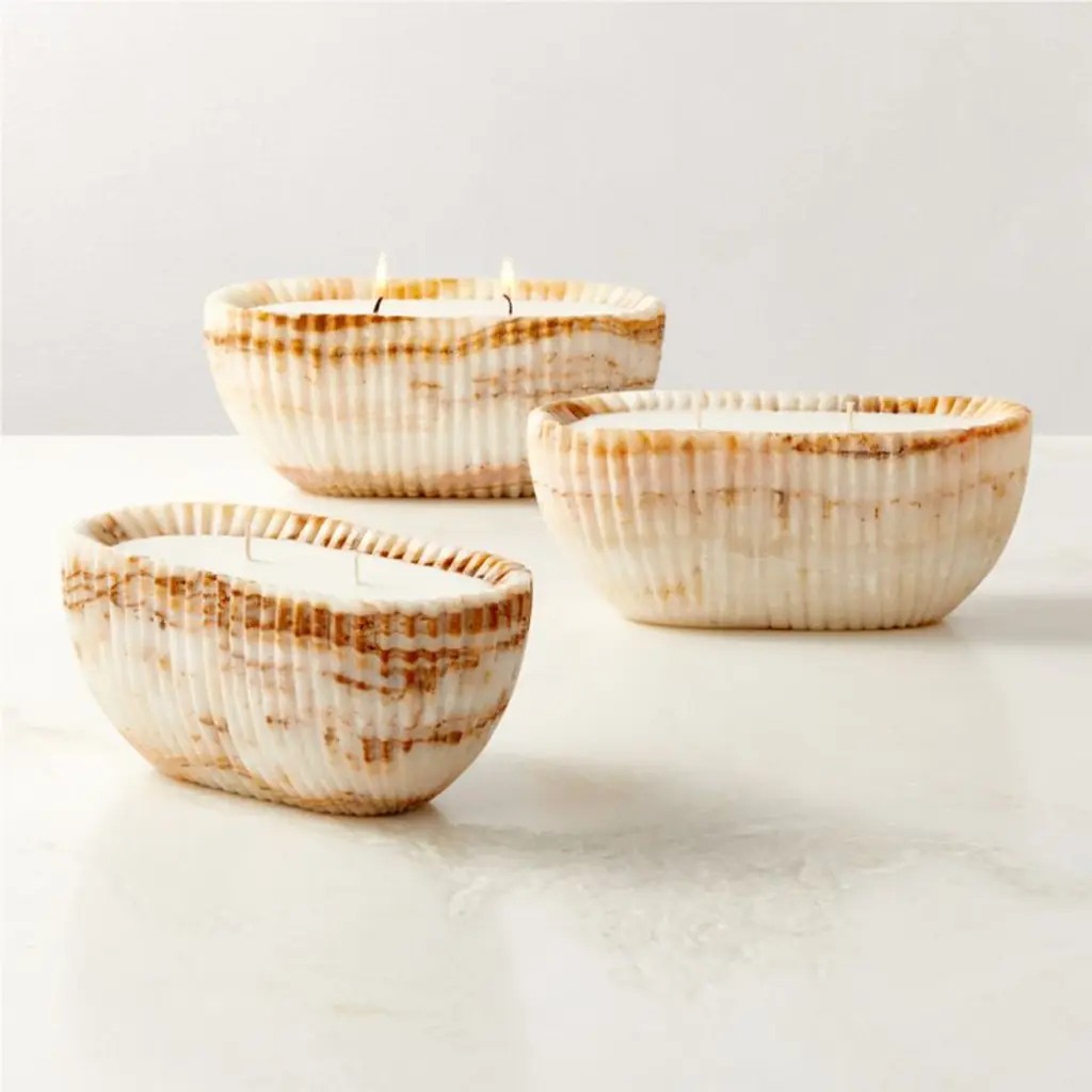 Carved from a solid piece of onyx, candle bowl is adorned with unique marbled activity and fluted detailing throughout. Inside, a hand-poured wax candle has two wicks to create twice the flickering allure. After the candle is fully burned, the vessel may be repurposed into a decorative bowl. CB2 exclusive.