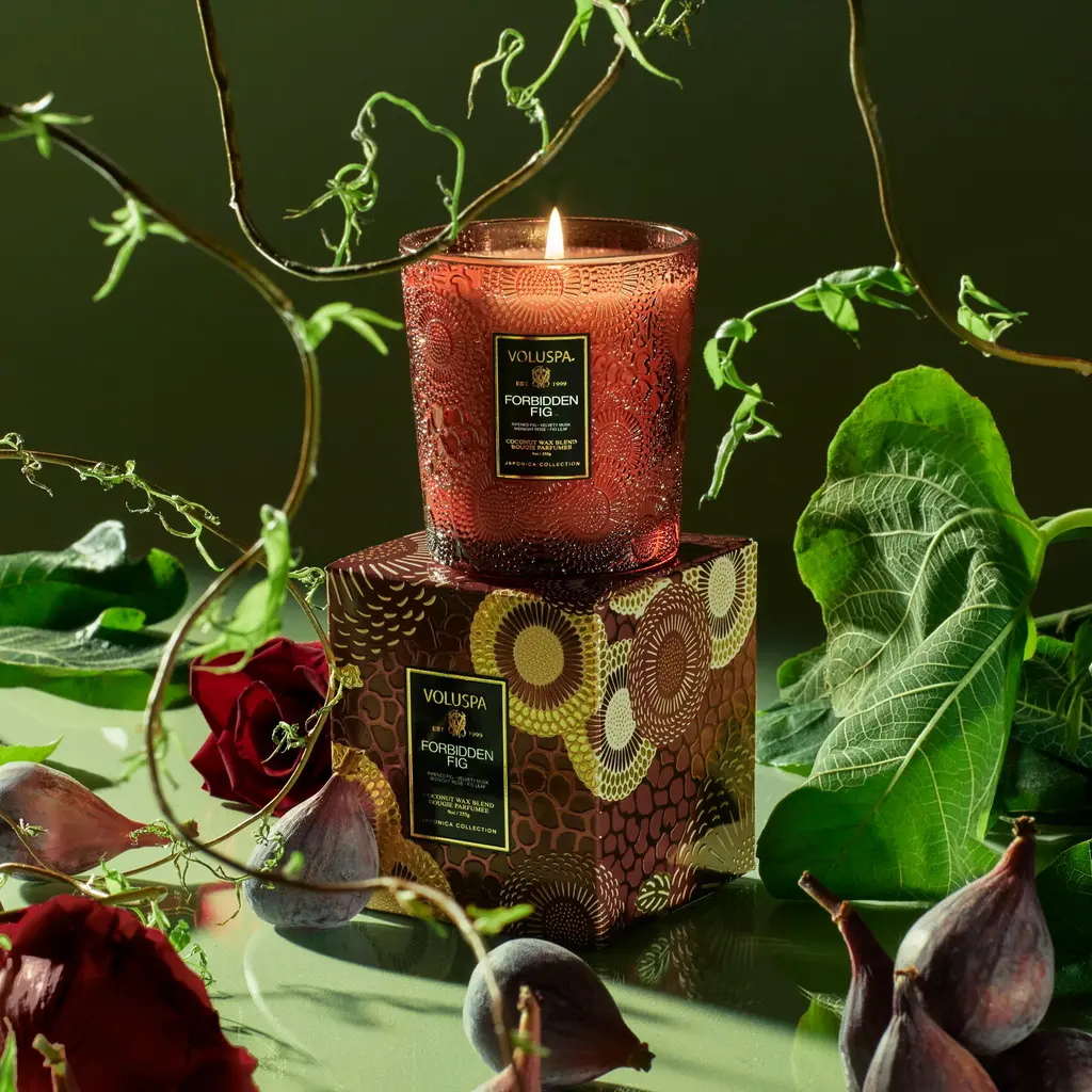Unearth the mystique of the wild fig tree with Voluspa's Forbidden Fig Collection, featuring a complex yet smooth medley of plump berries, fallen leaves and midnight rose crowned with velvety fig.