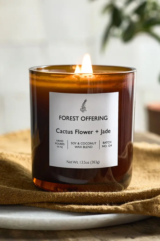 A gorgeous warm floral candle from Forest Offering. Each candle arrives with a wood wick that gives a fireplace crackle when lit. Candles are topped with dried botanicals that recall its fragrance, evoking all the senses. With top notes of agave and aloe, middle notes of chrysanthemum, green floral, green leaves, and orange and base notes of patchouli and fir.