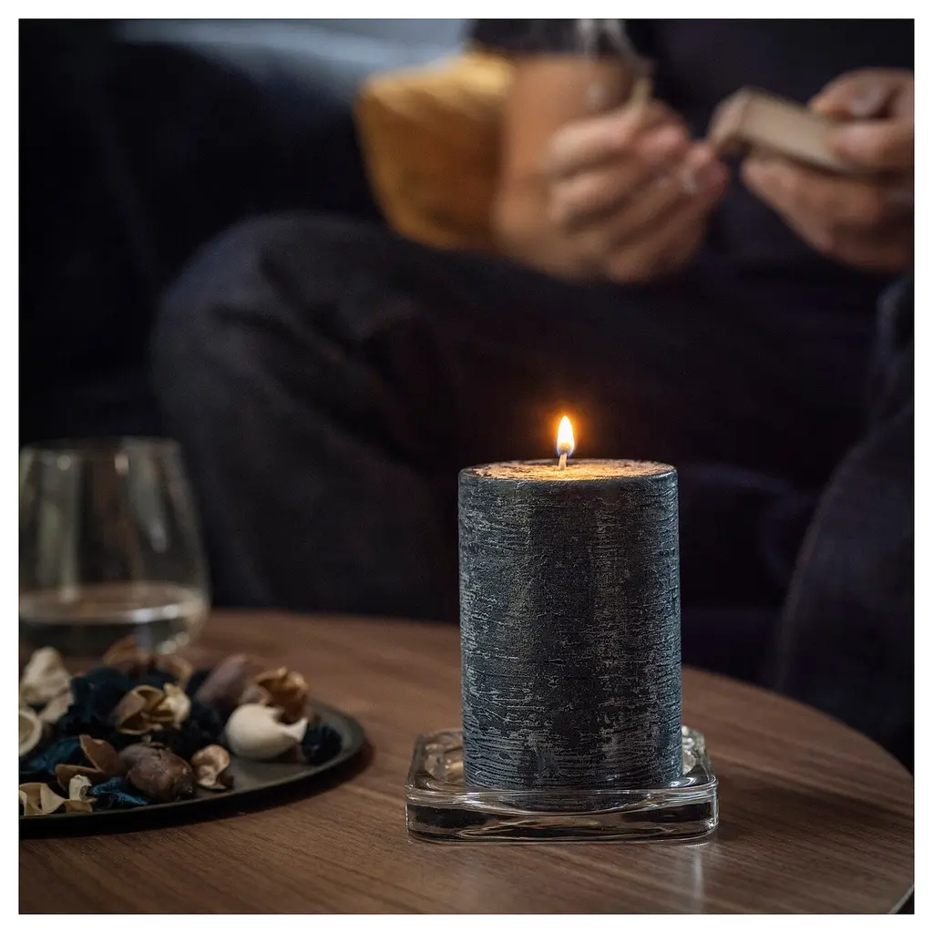 FRUKTSKOG Scented pillar candle - vetiver & geranium/black-turquoise 30 hr. A rustic scent of forests and flowing streams. Suitable when you want to create a pleasant atmosphere at home with inspiration from Scandinavian outdoor life. At least 50% of the wax in this product is plant-based wax.