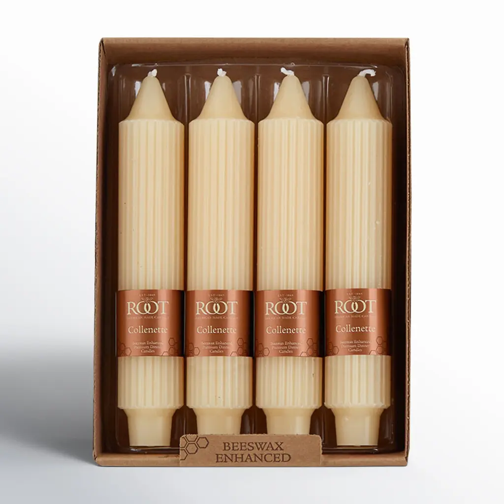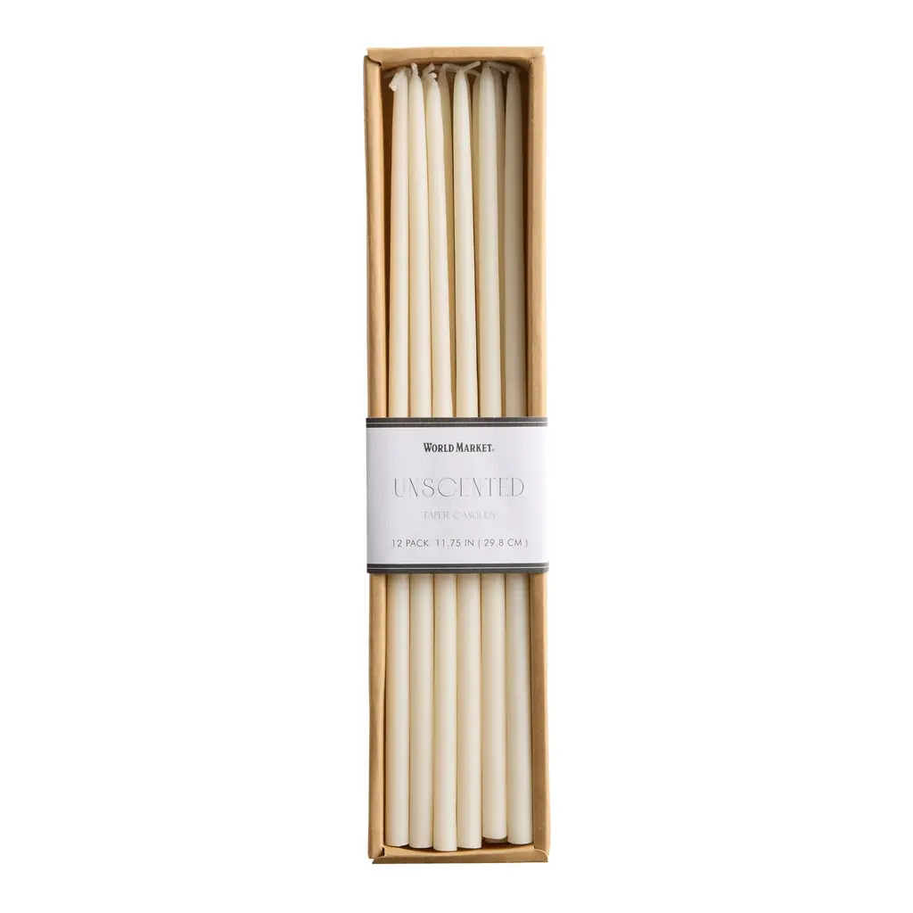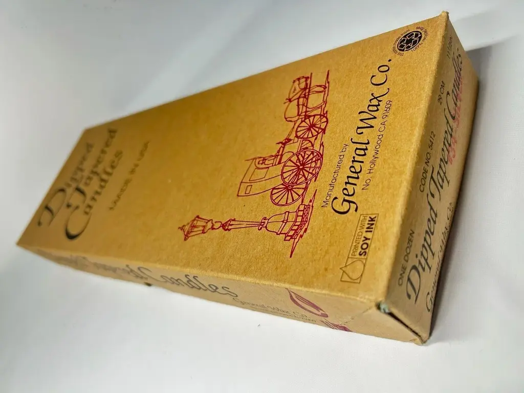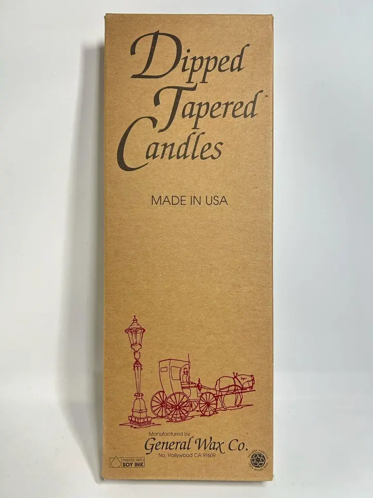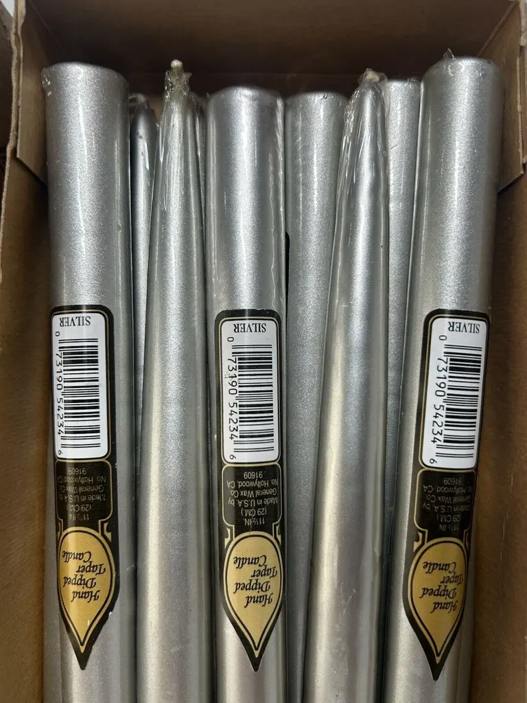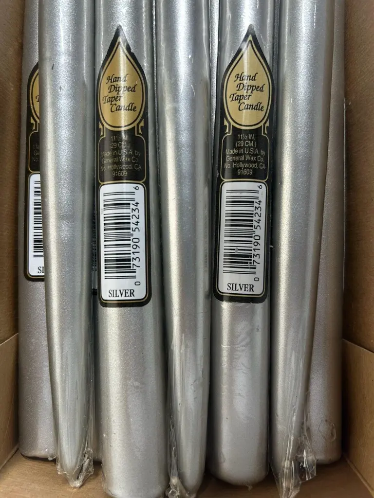 Item: Dipped tapered candles. Maker: General Wax Co. Origin: No. Hollywood, CA 91609, USA. Quantity: 1 dozen. Color: Silver. Scented: No. Candle type: Taper/Stick Description: 12 inch, high quality tapered candles coated with a beautiful metallic finish, shrink wrap sealed, box of 12 in a carton. Perfect for the holidays or any event. Add a touch of elegance to any gathering, wedding or dinner party with these 12 inch metallic tapered candles! Measures: 12 Height x .72 Diameter inches each.