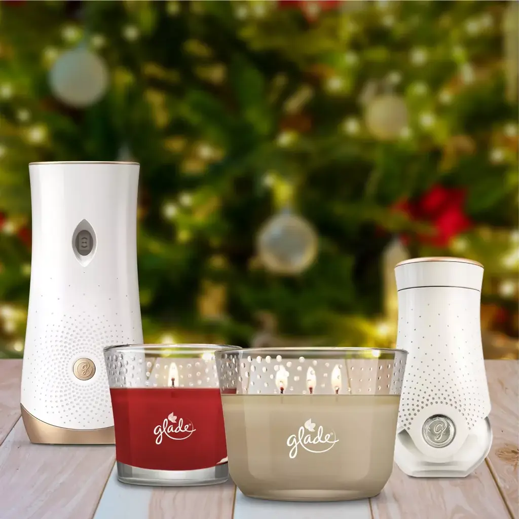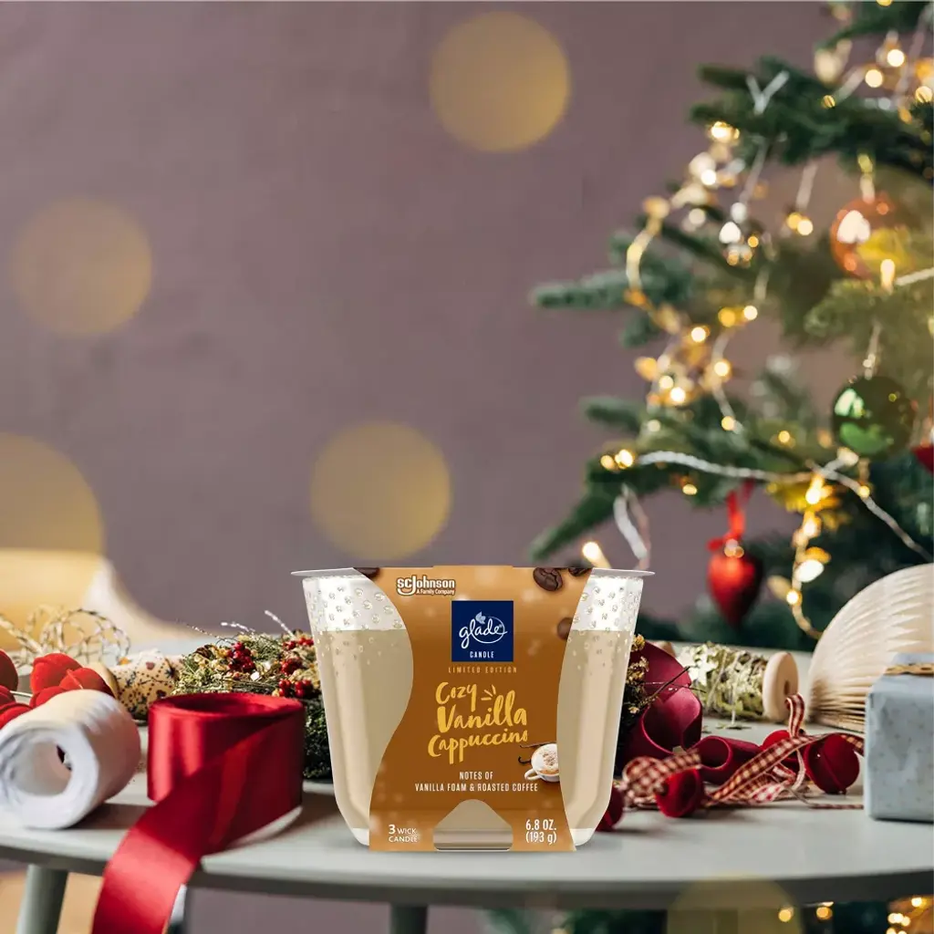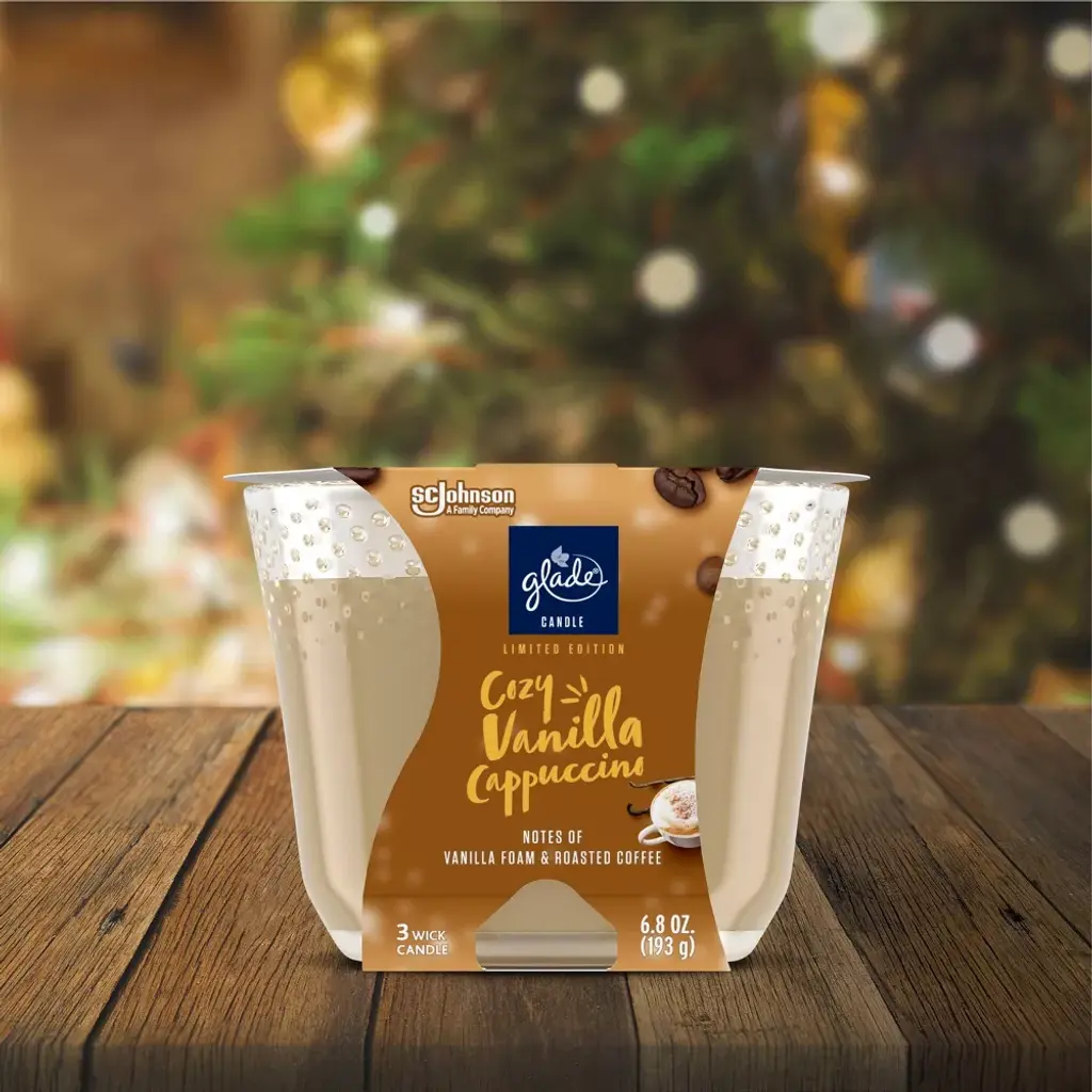 Glow up the holidays with Cozy Vanilla Cappuccino Glade 3-wick scented candles. This limited edition roasted coffee and hazelnut scented glass jar candle is a great way to add a little warmth and comfort to any moment with winter scents and festive fragrance. The Glade Cozy Vanilla Cappuccino candle features a features a warm and inviting blend of vanilla foam, roasted coffee and toasted hazelnuts that blend harmoniously to create the perfect mood for special moments. Perfect for bringing a cozy vibe to any space! The fragrances in these coffee scented candles are crafted by master perfumers and include fragrance infused with essential oils. These Glade fall scents are crafted by master perfumers and include fragrance infused with essential oils. This three wick candle in glass fills the room with 3x more glow (vs. Glade single wick candles). Looking for great gift ideas? Why not share the joy of masterfully crafted fragrances by gifting these triple wick candles to friends and loved ones. The Glade Holiday Glow Collection is a range of limited-time-only Glade winter scents that will get you in the mood to put on your most festive sweater and will surround you with holiday spirit and fragrances inspired by the joy of the season. Make your home smell festive this winter with Glade.