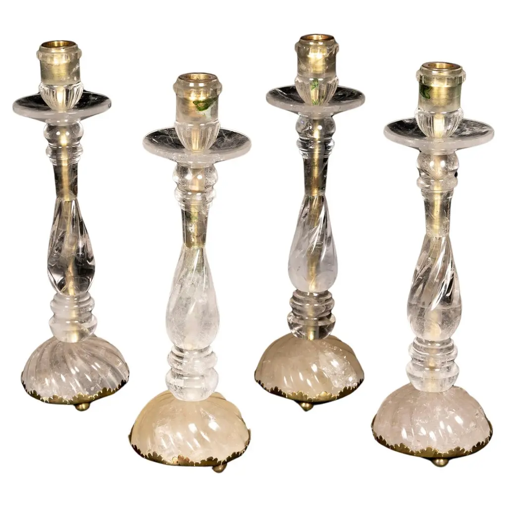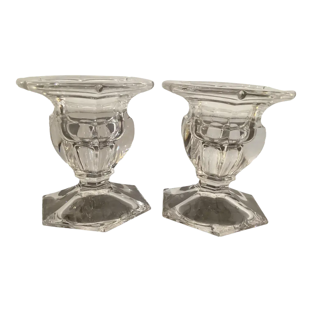 Set of five French pressed glass candle pillars featuring a striking gold ombre finish. These elegantly tapered pieces showcase intricate patterns and fluted accents, perfect for sophisticated tablescapes. Each stands as a testament to classic French craftsmanship, making them exceptional additions to any decor collection. Dimensions: large, 6"L x 6"W x 15.5"H; small, 4.5"L x 4.5"W x 12"H.
