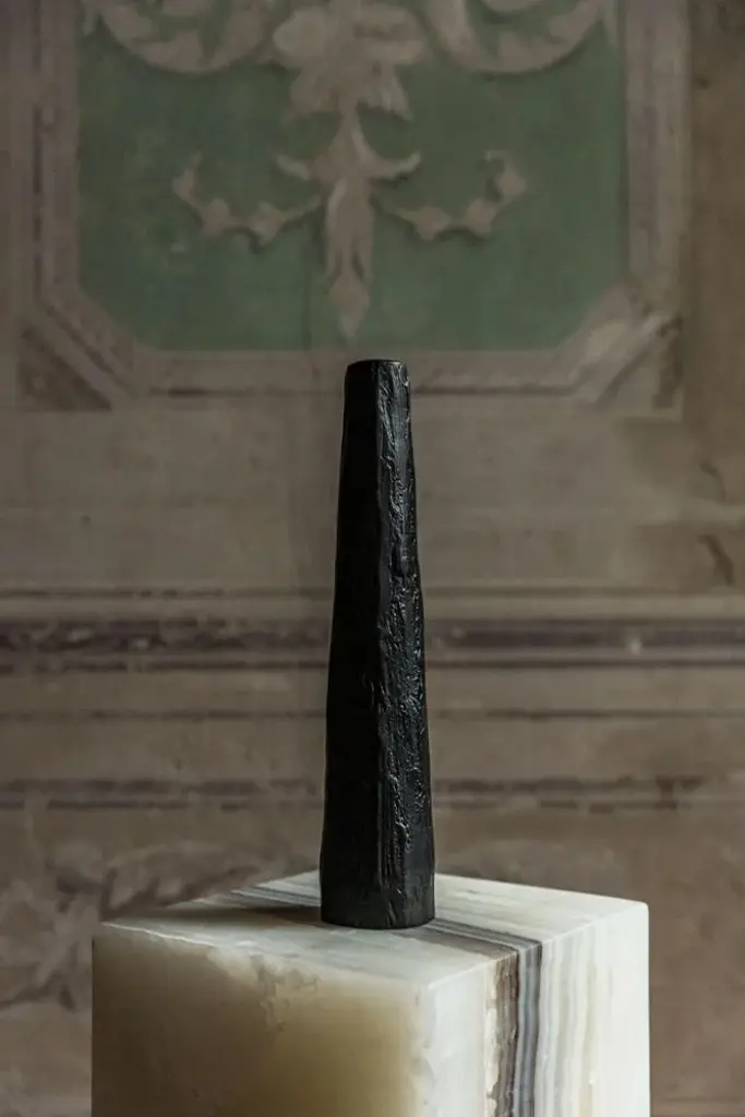 Grande candle pillar by rick owens 2015 dimensions: l 7.5 x w 7.5 x h 41 cm materials: bronze weight: 3.4 kg available in black finish or nitrate (dark brown) finish, please contact us. Rick owens is a california-born fashion and furniture has developed a unique style that he describes as “luxe minimalism.” though his designs are simple and spare, owens thrives on theatricality — producing wildly original runway shows featuring gender-fluid models of all ages and shapes. Inspired by his longtime partner and muse, michele lamy, clothes and furniture alike feature dark grays, blacks and browns. Like his frontier forebears, owens finds his strongest influences in nature — his furniture and housewares have simple, organic shapes, and a few items even feature his distinctly 21st century take on antlers. This piece is attributed to the mentioned designer/maker. It has no attribution mark and no official proof of authenticity, however it is well documented in design history. I take full responsibility for any authenticity issues arising from misattribution