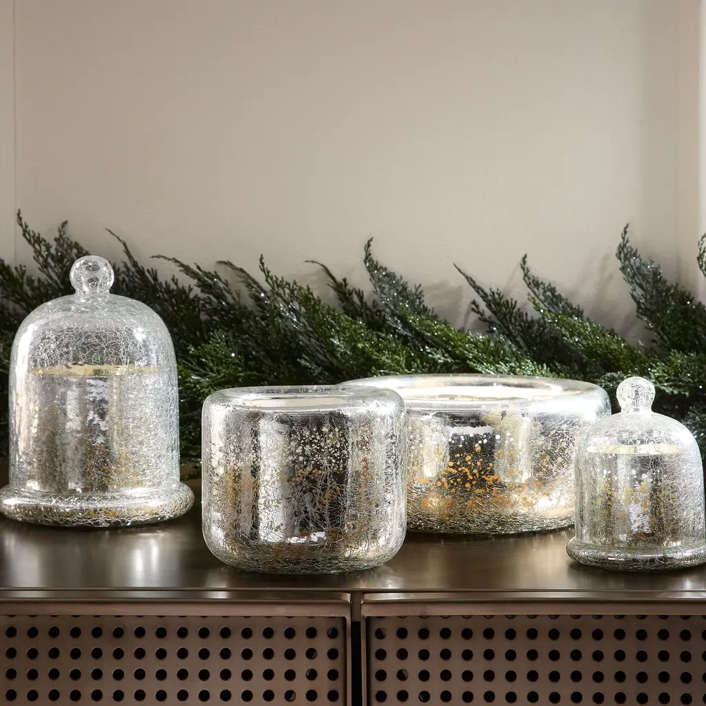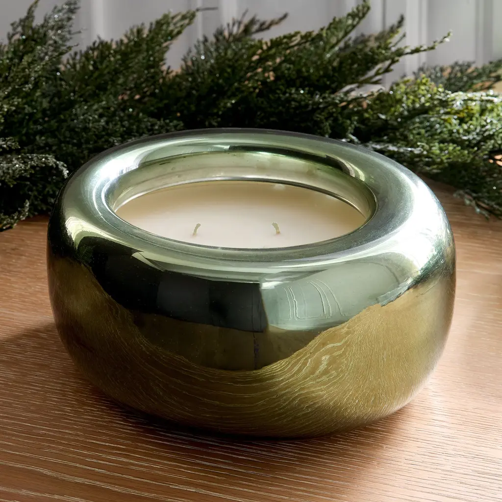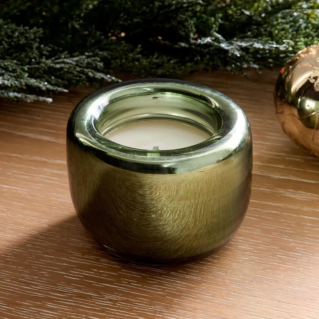 The eye-catching beauty of mercury glass. Adds shine to a tabletop or mantel. Light this scented candle for a warm glow.