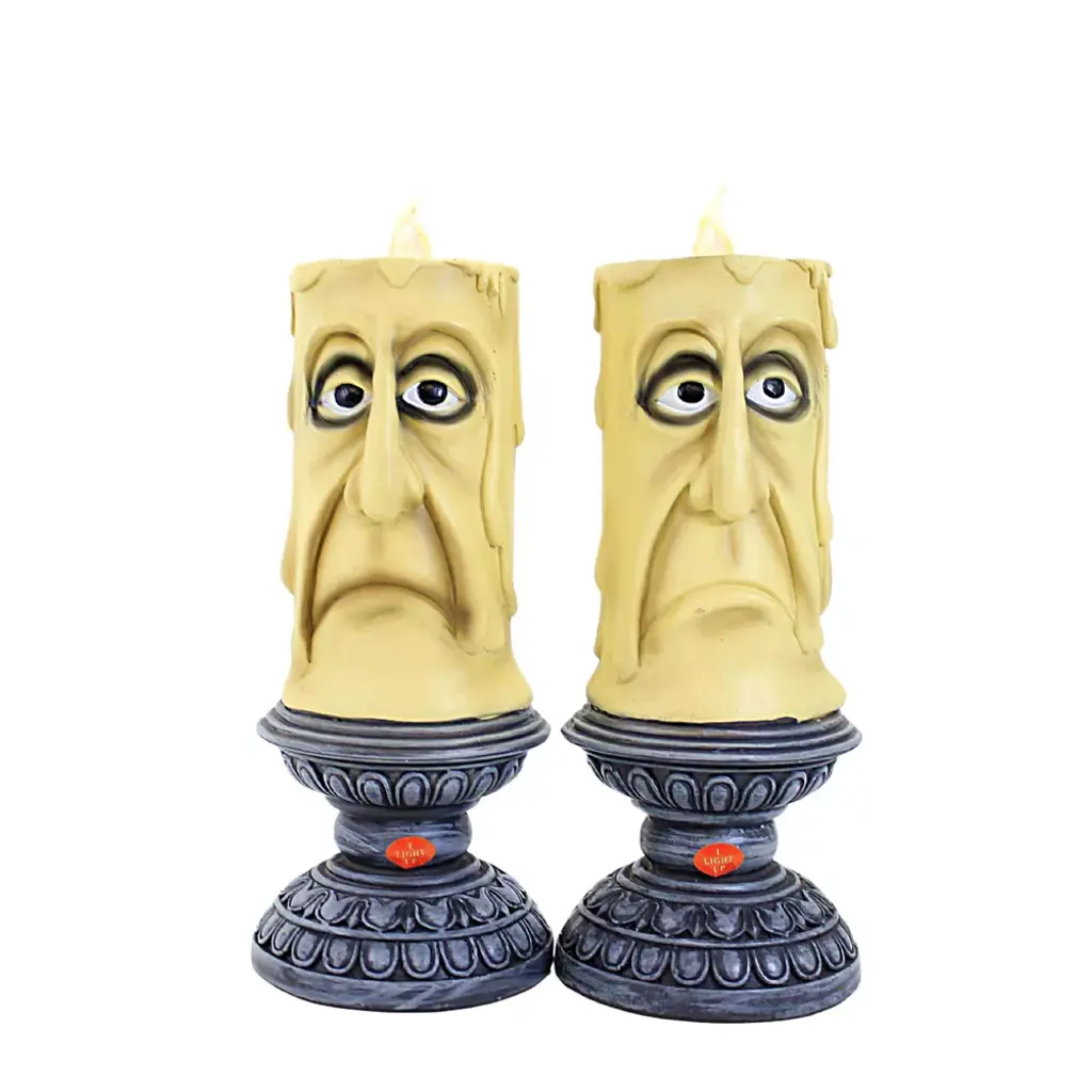 Set Of Two Battery Operated Halloween Lit Pillar Candles Containing A Droopy Scary Face. The Candle Looks Like It's Burning With The Wax Dripping Down The Sides.. New.. Measurements 8.25 In H X 3.75 In W X 3.75 In D. . No Assembly Required. Indoor Use Only. Imported