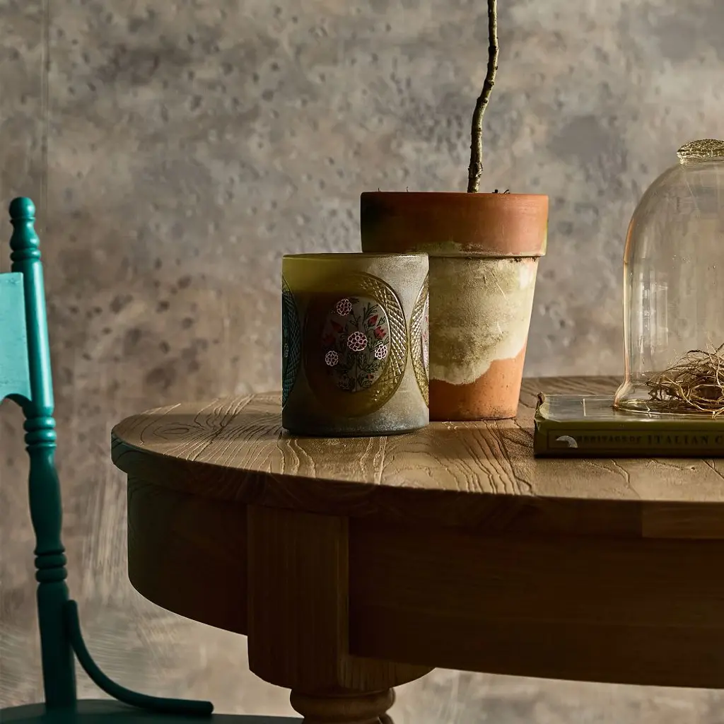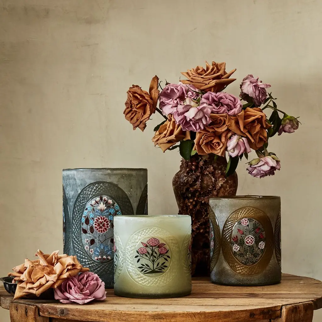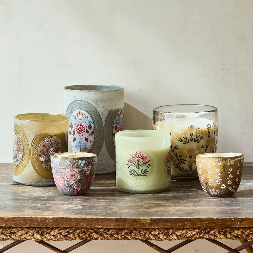 Bloom and glow. Etched with a series of ellipses, each handpainted with a floral pattern, these fragrance-free wax candles are poured into a recycled glass pot. Illumination for inspired spaces.