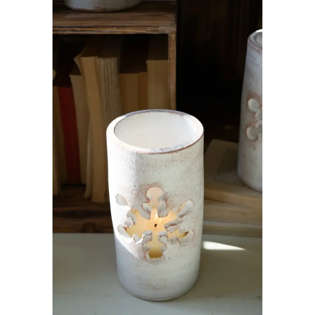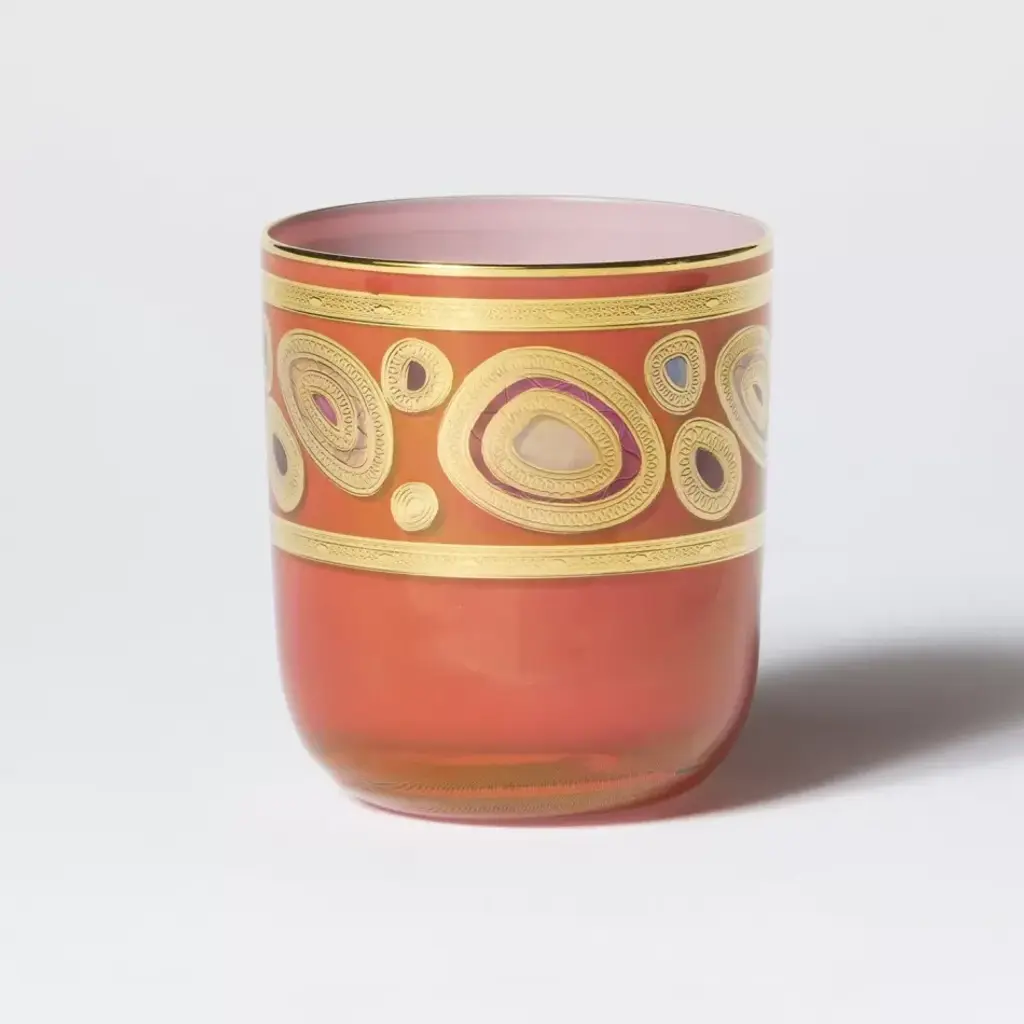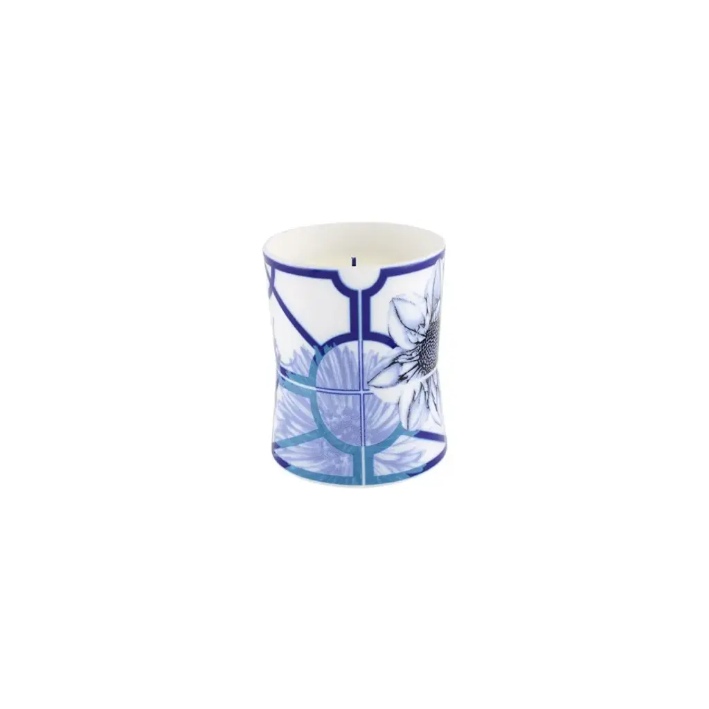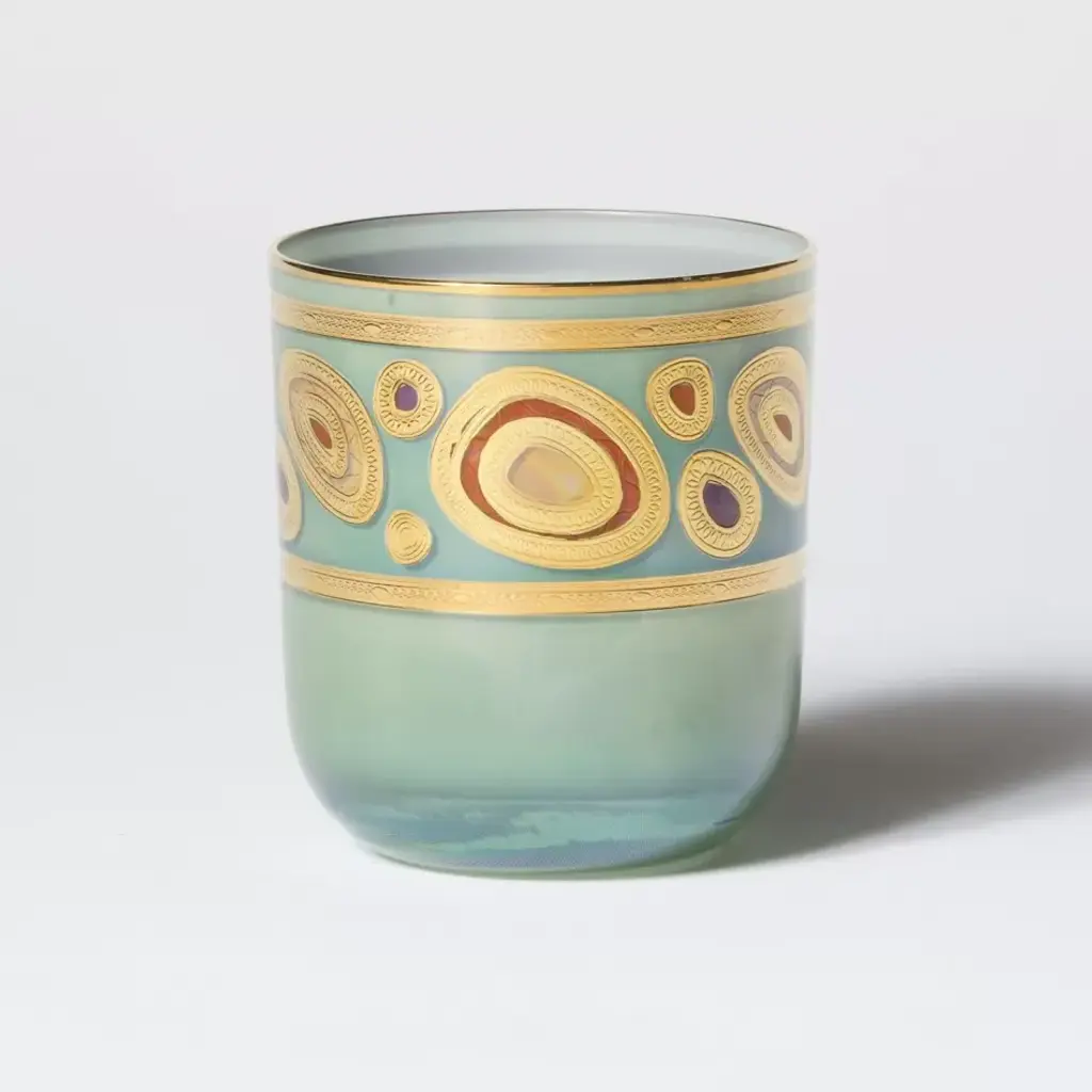 Bloom and glow. Etched with a series of ellipses, each handpainted with a floral pattern, these fragrance-free wax candles are poured into a recycled glass pot. Illumination for inspired spaces.