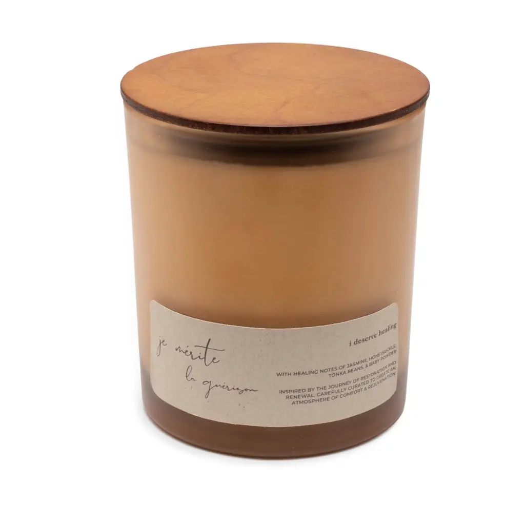 je mérite la guérisoninspired by the journey of restoration and renewal, the "i deserve healing" candle is crafted to create an atmosphere of comfort and rejuvenationinfused with therapeutic notes of jasmine, honeysuckle, tonka, & baby powder, it’s designed to help release tension and encourage emotional and physical healingeach gentle flicker serves as a reminder that healing is a process, and you deserve the time and space to nurture your body and soullet "i deserve healing" guide you toward wholeness, offering a peaceful calm for your inner sanctuary