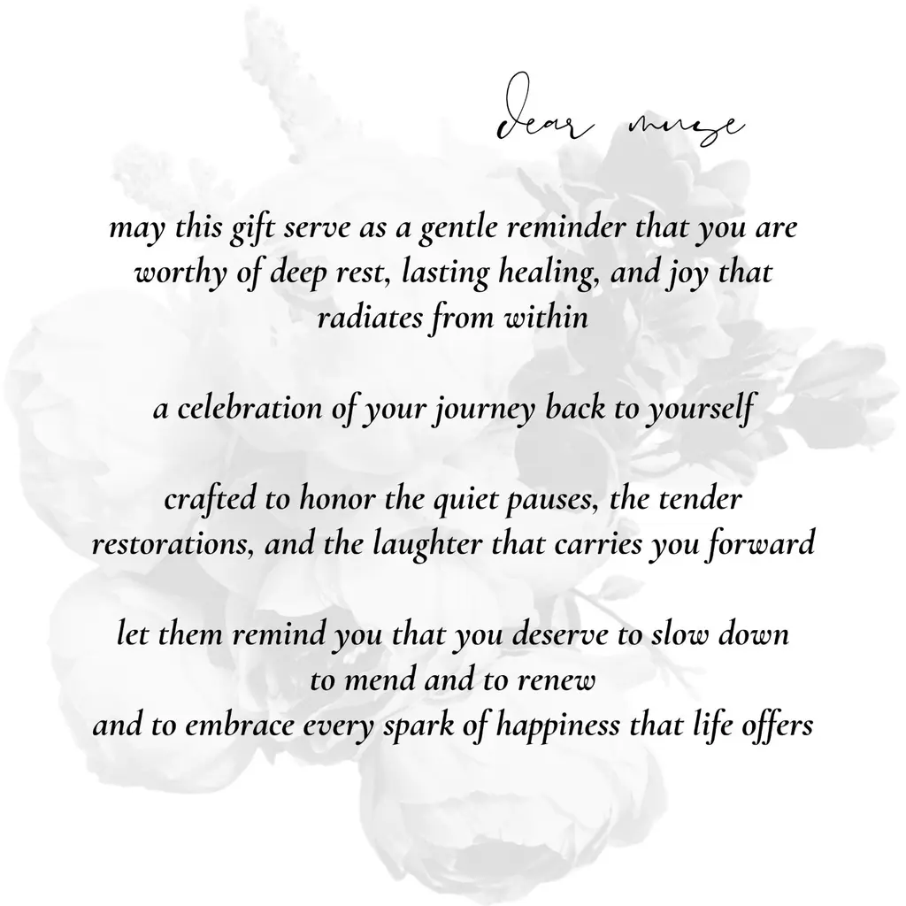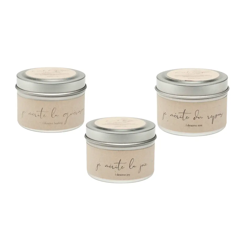 our hand-poured candles are infused with uplifting scents and affirmations, helping you create a sense of sanctuary and self-care no matter where life takes youset includes: je mérite la guérison, i deserve healing candle - with therapeutic notes of jasmine, honeysuckle, tonka, & baby powder, it’s designed to help release tension and encourage emotional and physical healingje mérite du repos, i deserve rest candle - with comforting notes of eucalyptus, bergamot, sandalwood, & lavender, this scent cradles you in a cocoon of calmje mérite la joie, i deserve joy candle - with uplifting notes of cucumber, honeydew melon, saltwater, & petrichor, this scent fills your space with warmth and positivity, sparking a sense of pure joyenjoy!