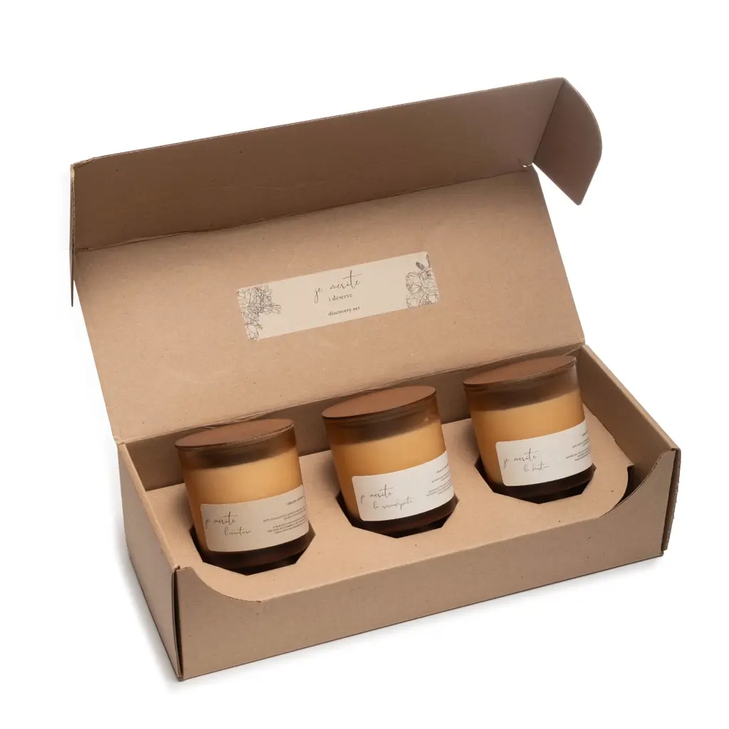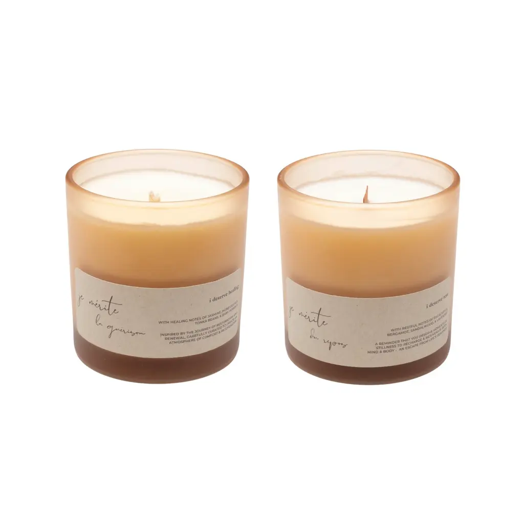pack light, travel well, and nurture your spirit with every burnperfectly sized for on-the-go moments, these hand-poured travel candles are infused with uplifting scents and affirmations, helping you create a sense of sanctuary and self-care no matter where life takes youthis is your invitation to pause, breathe, and come home to yourselfperfect as a gift or a personal ritual setset includes: i deserve serendipity - with notes of nag champa, wild honeysuckle, and amberi deserve kismet - with warm notes of chai, anise, and a touch of ginger and honeyi deserve adventure - refreshing notes of bergamot, eucalyptus and aromatic basilenjoy!