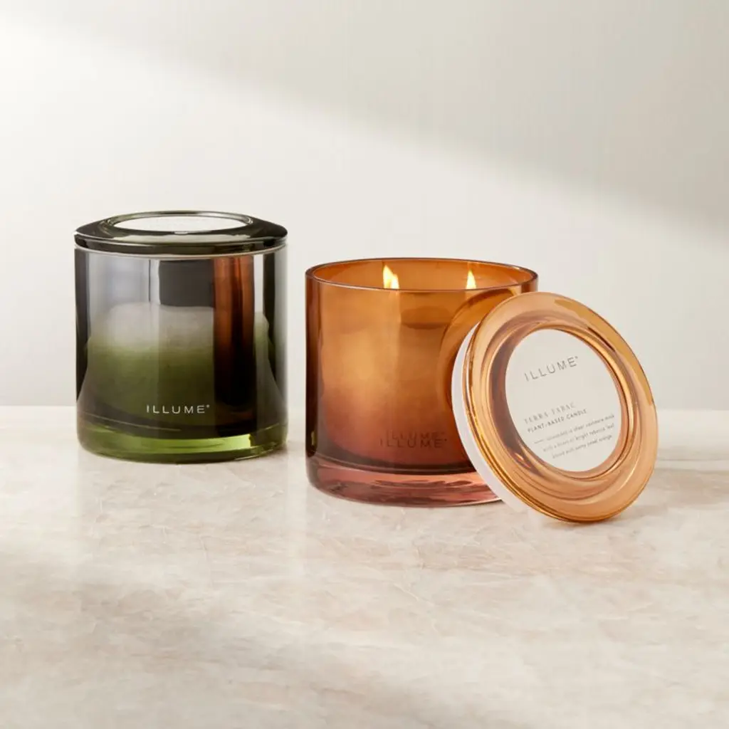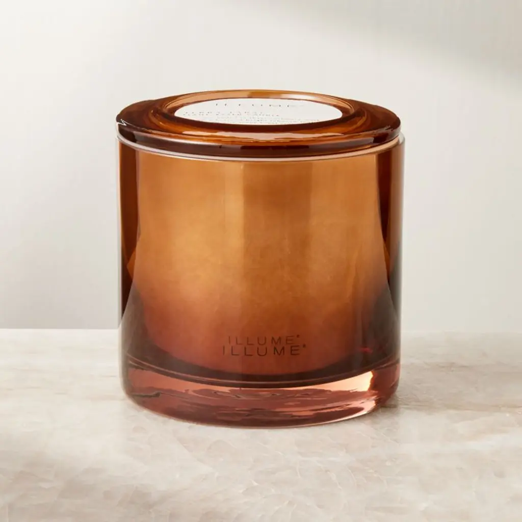 Designed as a centerpiece item, triple-wick candle by Illume builds upon a base of warm cashmere musk with notes of tobacco leaf and sweet orange. The soy wax blend is hand-poured into a dark amber glass vessel with an ombre effect that's nothing short of mesmerizing when flames flicker within.