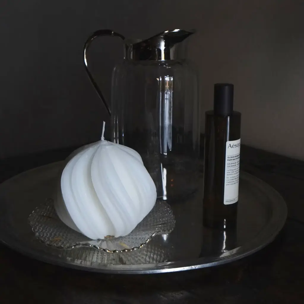 A combination of the traditional craftsmanship and cutting-edge technology, each piece from this set of three candles is made of resin derived from olive pruning, subsequently transformed into a splendid origami using 3D printing techniques. The delicateness of the candle contrasts with the hand-turned bronze base.