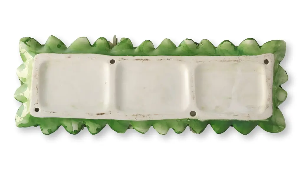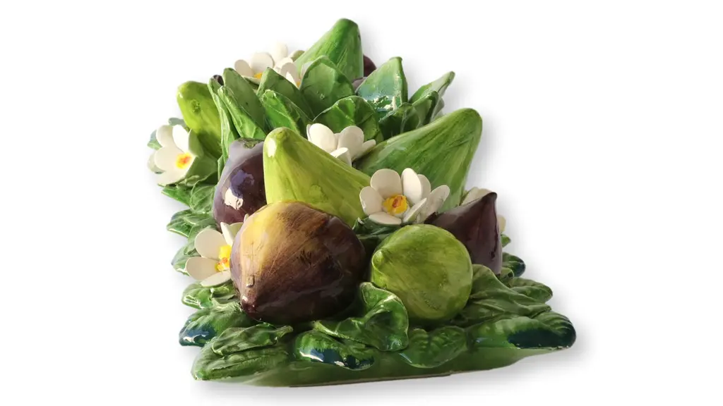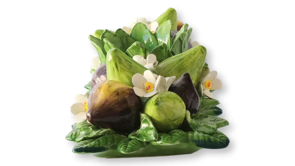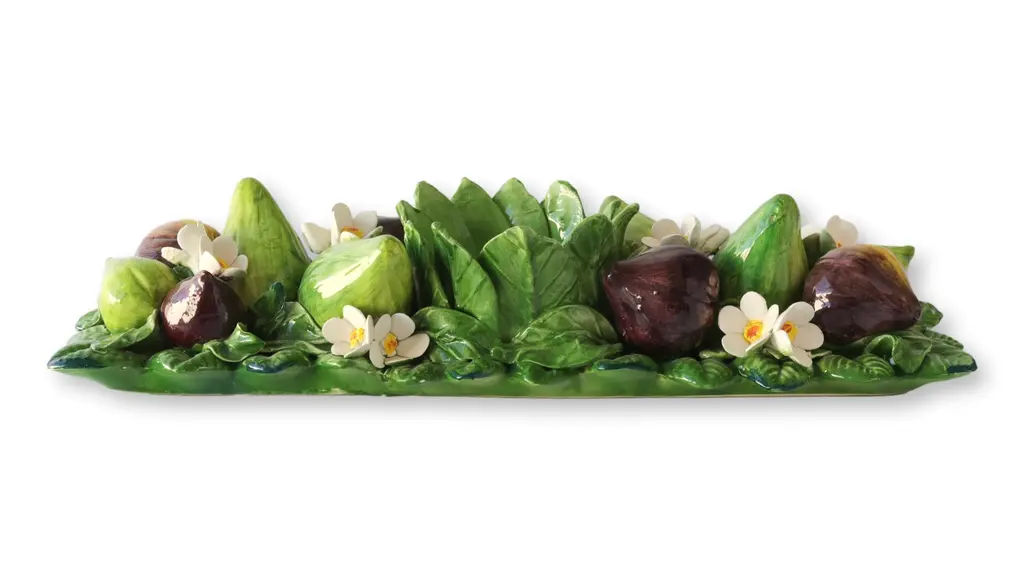 Vibrant and sculptural Italian trompe l'oeil fig and flower candleholder centerpiece, molded in high relief with an abundance of leafy greens, hand-painted figs in varying ripeness, and delicate white floral accents. At the center sits a cabbage-form taper holder, discreetly integrated into the arrangement. A standout decorative piece for seasonal or everyday dining tablescapes, especially when paired with matching majolica. Unsigned.