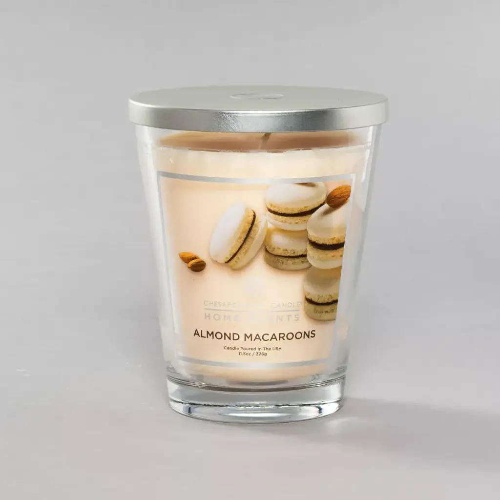 Create a warm and welcoming environment in any room of your home with the delightfully sweet aroma of this Home Scents Almond Macaroons Glass Jar Candle from Chesapeake Bay Candle. This off-white colored candle comes in a clear glass container with a metal lid, and combines the scents of almond and delicious macaroons to fill your home with an inviting atmosphere.