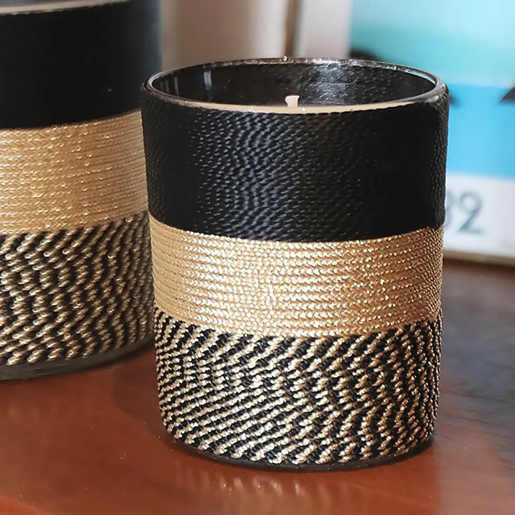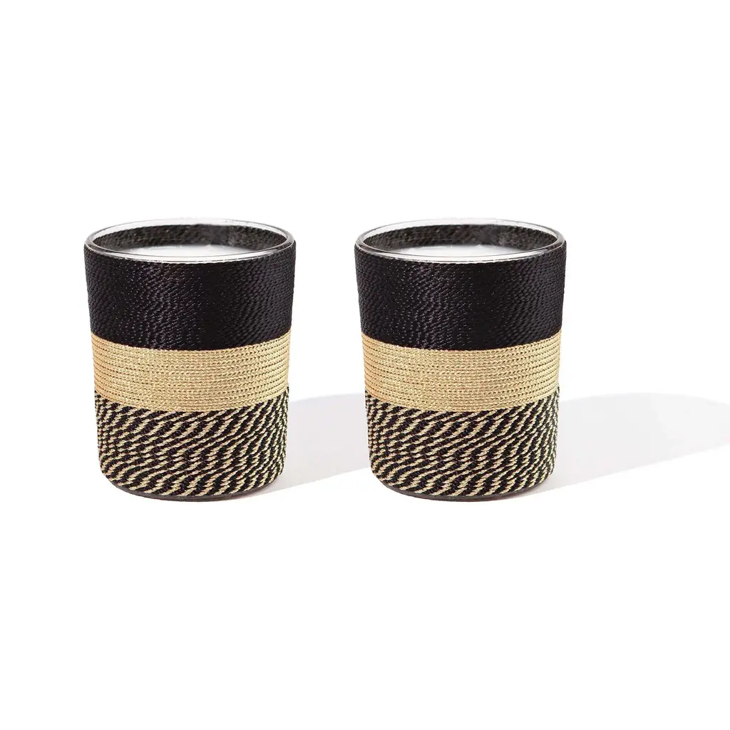 The lovely jasmine candle set is handmade in Morocco. Wind down at the end of the night with this calming scent. Each jasmine candle is placed inside a glass vessel with an elegant woven raffia basket container that is reusable. Includes two Jasmine candles. 40-hour burn time per candle. Featured on Domino Magazine Online.