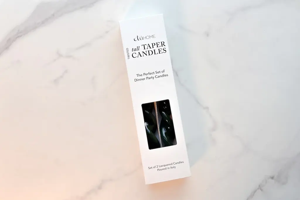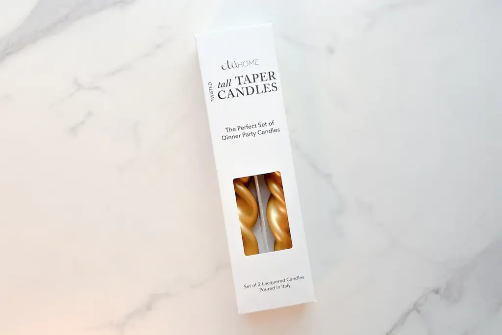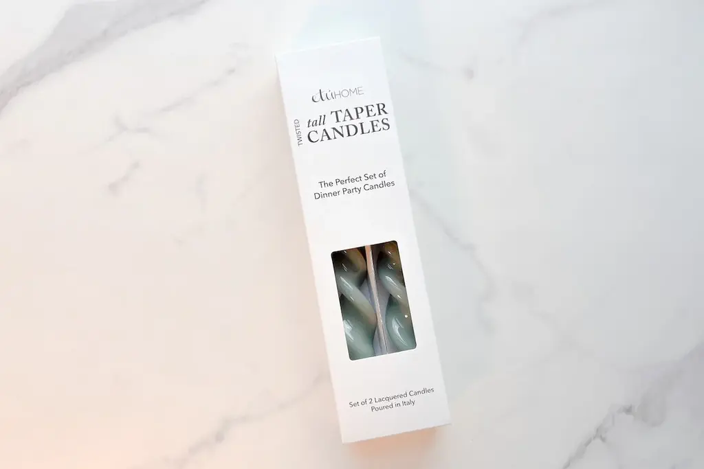 Make a statement at any dinner party with this set of taper candles. The modern twist design and elegant shape make for a stylish addition to any table setting. Display as-is for a pop of color on your console, or enjoy the 5-hour burn and impress guests all evening. Fragrance Free Lacquered taper candles 4-5 hours of continuous burning time