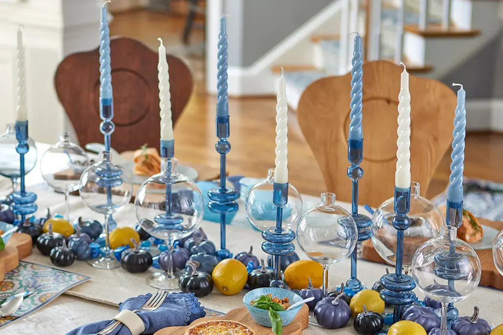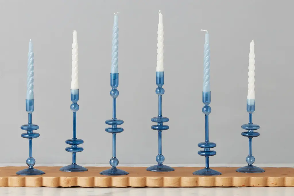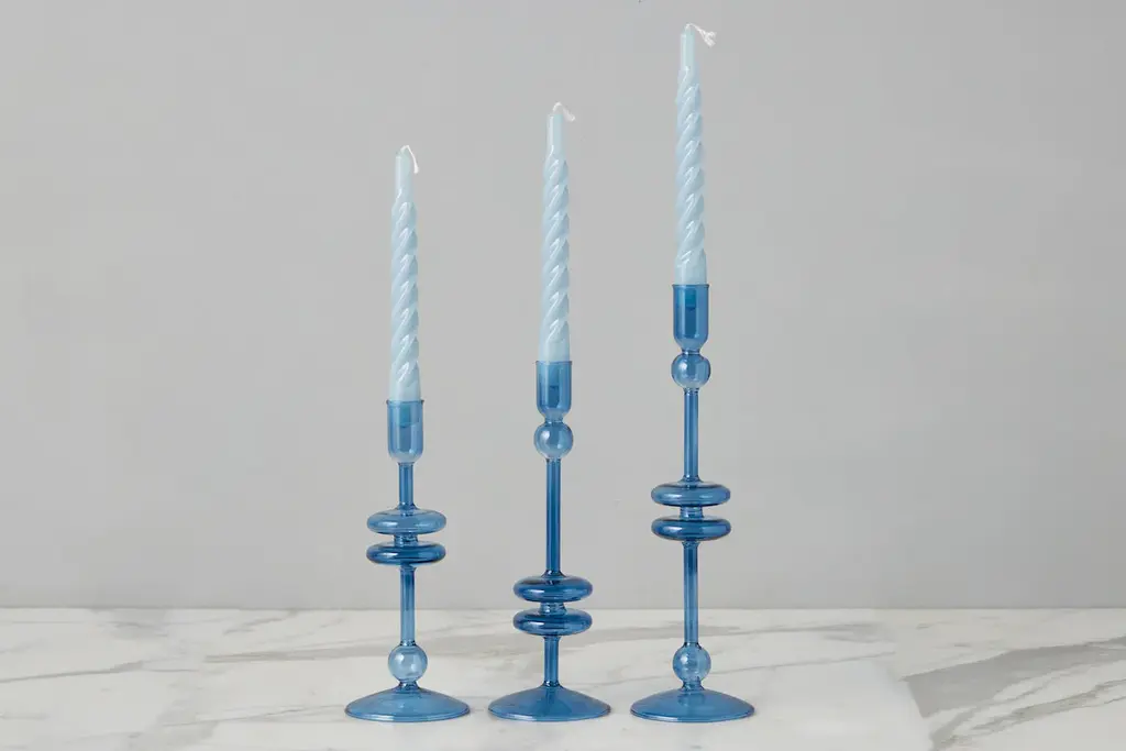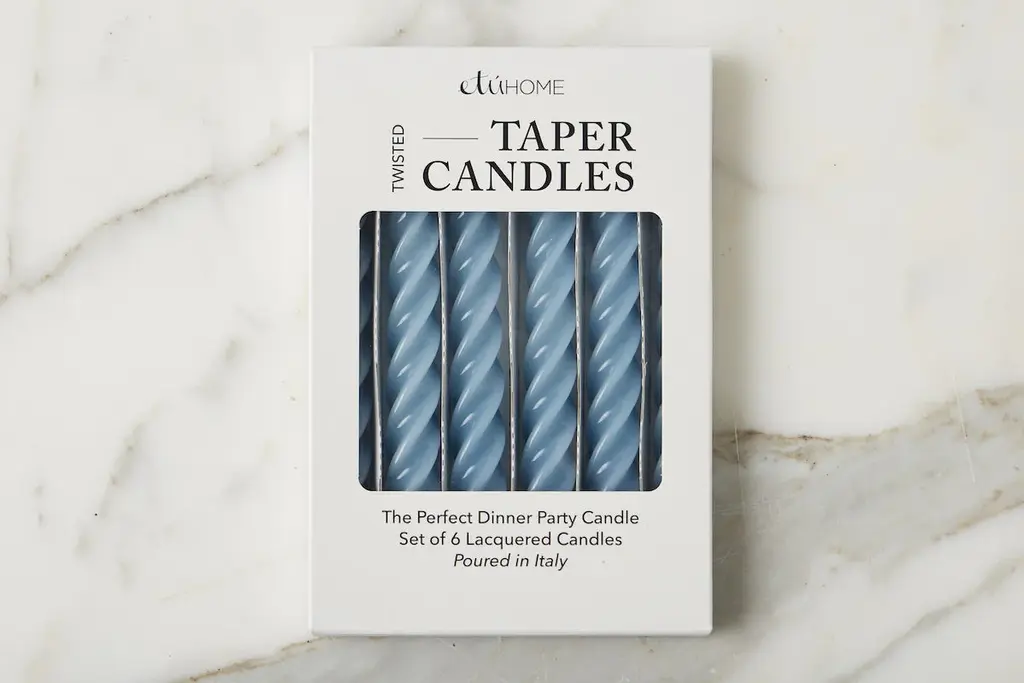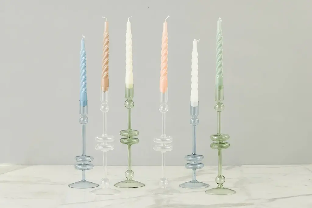Make a statement at any dinner party with this set of taper candles. The modern twist design and elegant shape make for a stylish addition to any table setting. Display as-is for a pop of color on your console, or enjoy the 5-hour burn and impress guests all evening. Fragrance Free Lacquered taper candles 4-5 hours of continuous burning time