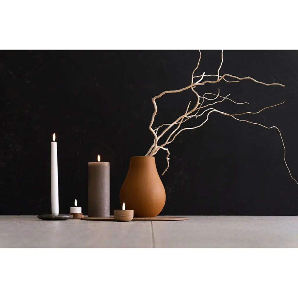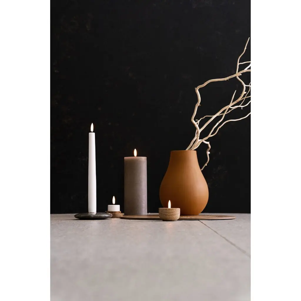 Uyuni Lighting's LED pillar candle is a safe way to create a warm and inviting atmosphere in your home – the kind that can only be achieved with the gentle flicker of a burning candle. The candle looks deceptively authentic: it is coated with real candle wax so the surface has a nice, rustic texture, and equipped with Uyuni's patented 3D flame that mimics the fluttering of a regular candle, glowing softly in a warm white tone. The battery-operated LED wax candles do not heat up during use and do not need to be monitored like regular candles, making them ideal for families with children or pets. Flameless LED candles are also great for centerpieces and other compositions as they do not pose a fire hazard even when in contact with other decorations. The Uyuni LED pillar candle has a built-in timer with which you can set the candle to burn for six hours. With the Uyuni remote control, available separately, the timer can be set for either 4, 6, 8 or 10 hours. With the remote control, the candle is also dimmable.