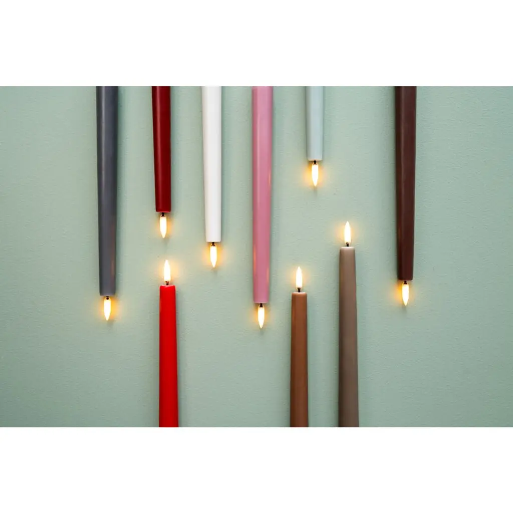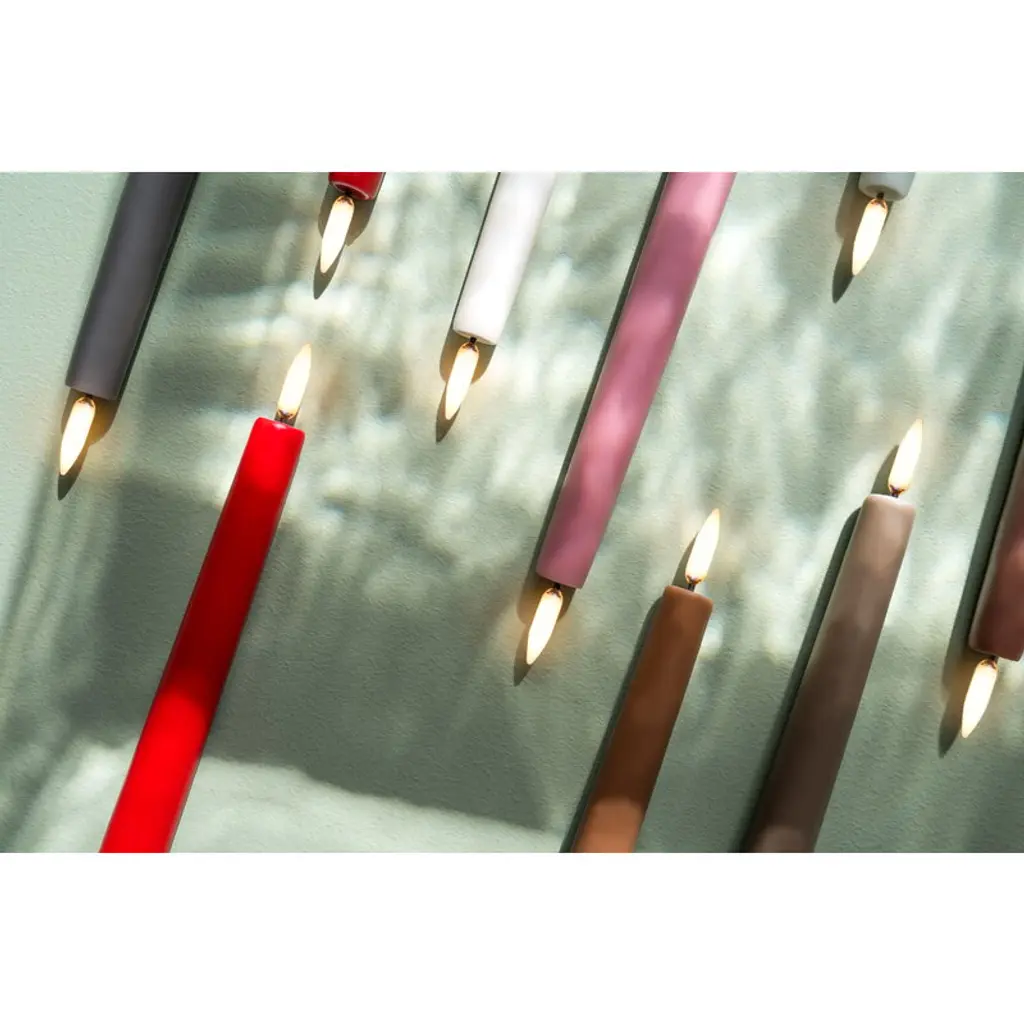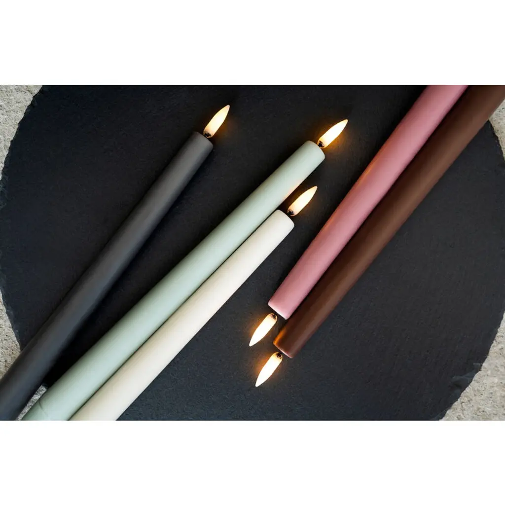 Uyuni Lighting's LED taper candles are a safe way to create a warm and inviting atmosphere in your home – the kind that can only be achieved with the gentle flicker of a burning candle. The LED candles look deceptively authentic: they are coated with real candle wax and equipped with Uyuni’s patented 3D flame that mimics the fluttering of a regular candle, glowing softly in a warm white tone. The battery-operated LED wax candles do not heat up during use and do not need to be monitored like regular candles, making them ideal for families with children or pets. Flameless LED candles are also great for centerpieces and other compositions as they do not pose a fire hazard even when in contact with other decorations. The Uyuni LED taper candles have a built-in timer with which you can set the candles to burn for six hours. With the Uyuni remote control, available separately, the timer can be set for either 4, 6, 8 or 10 hours. With the remote control, the candles are also dimmable.