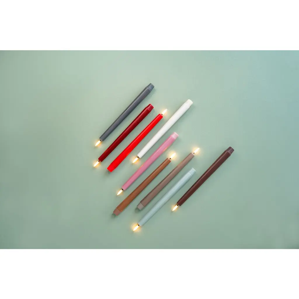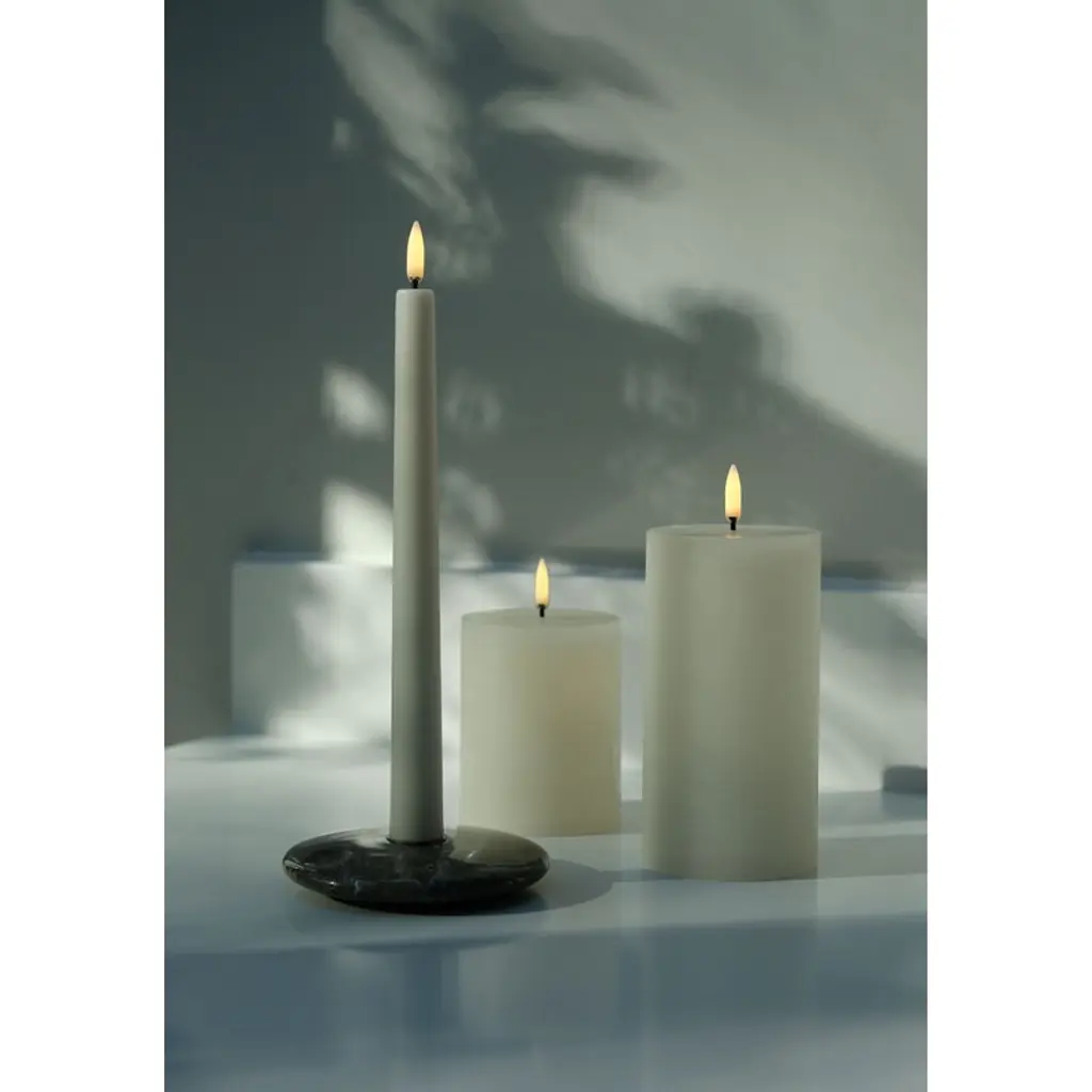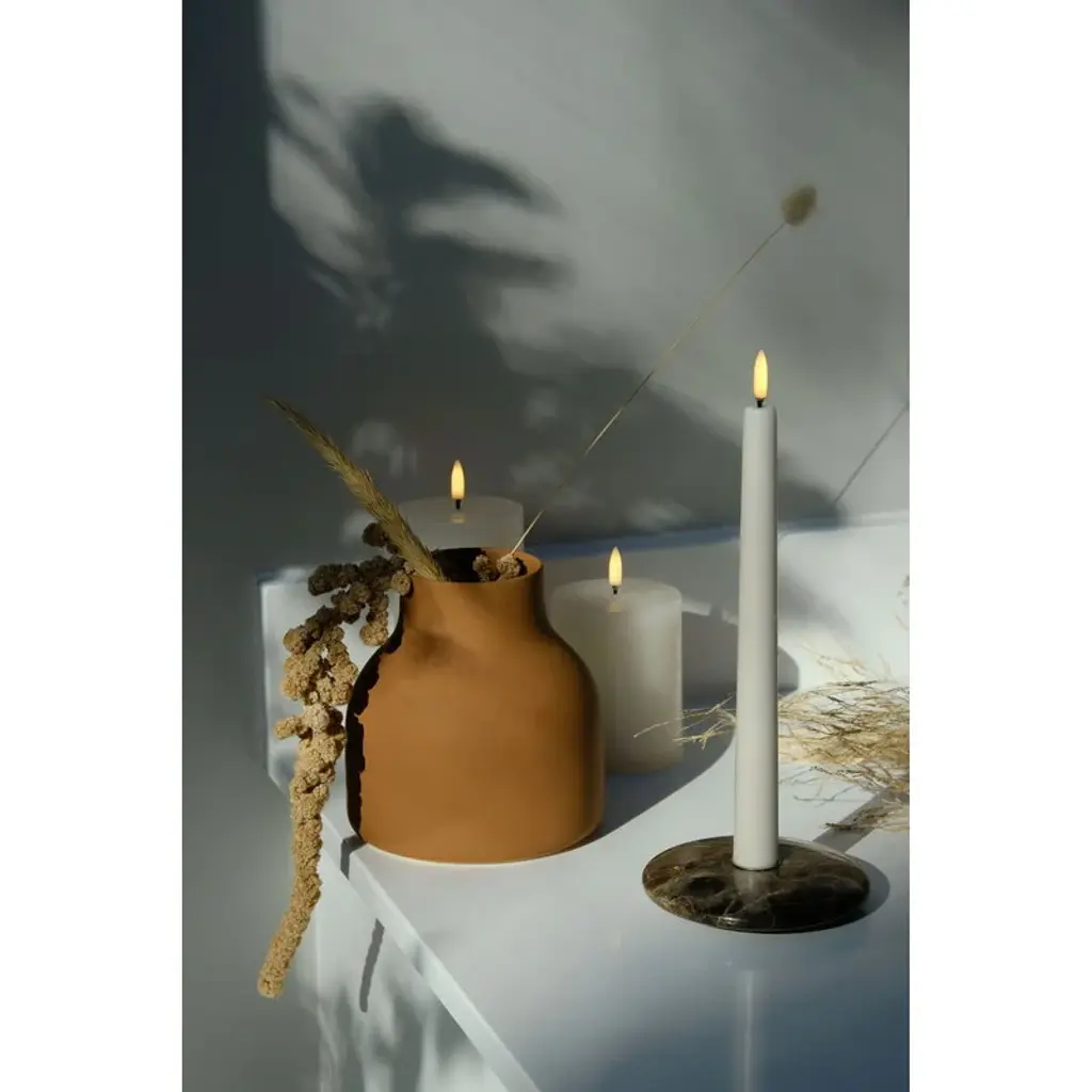 Uyuni Lighting's LED taper candles are a safe way to create a warm and inviting atmosphere in your home – the kind that can only be achieved with the gentle flicker of a burning candle. The LED candles look deceptively authentic: they are coated with real candle wax and equipped with Uyuni’s patented 3D flame that mimics the fluttering of a regular candle, glowing softly in a warm white tone. The battery-operated LED wax candles do not heat up during use and do not need to be monitored like regular candles, making them ideal for families with children or pets. Flameless LED candles are also great for centerpieces and other compositions as they do not pose a fire hazard even when in contact with other decorations. The Uyuni LED taper candles have a built-in timer with which you can set the candles to burn for six hours. With the Uyuni remote control, available separately, the timer can be set for either 4, 6, 8 or 10 hours. With the remote control, the candles are also dimmable.