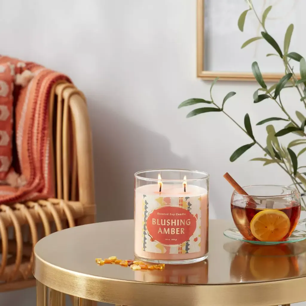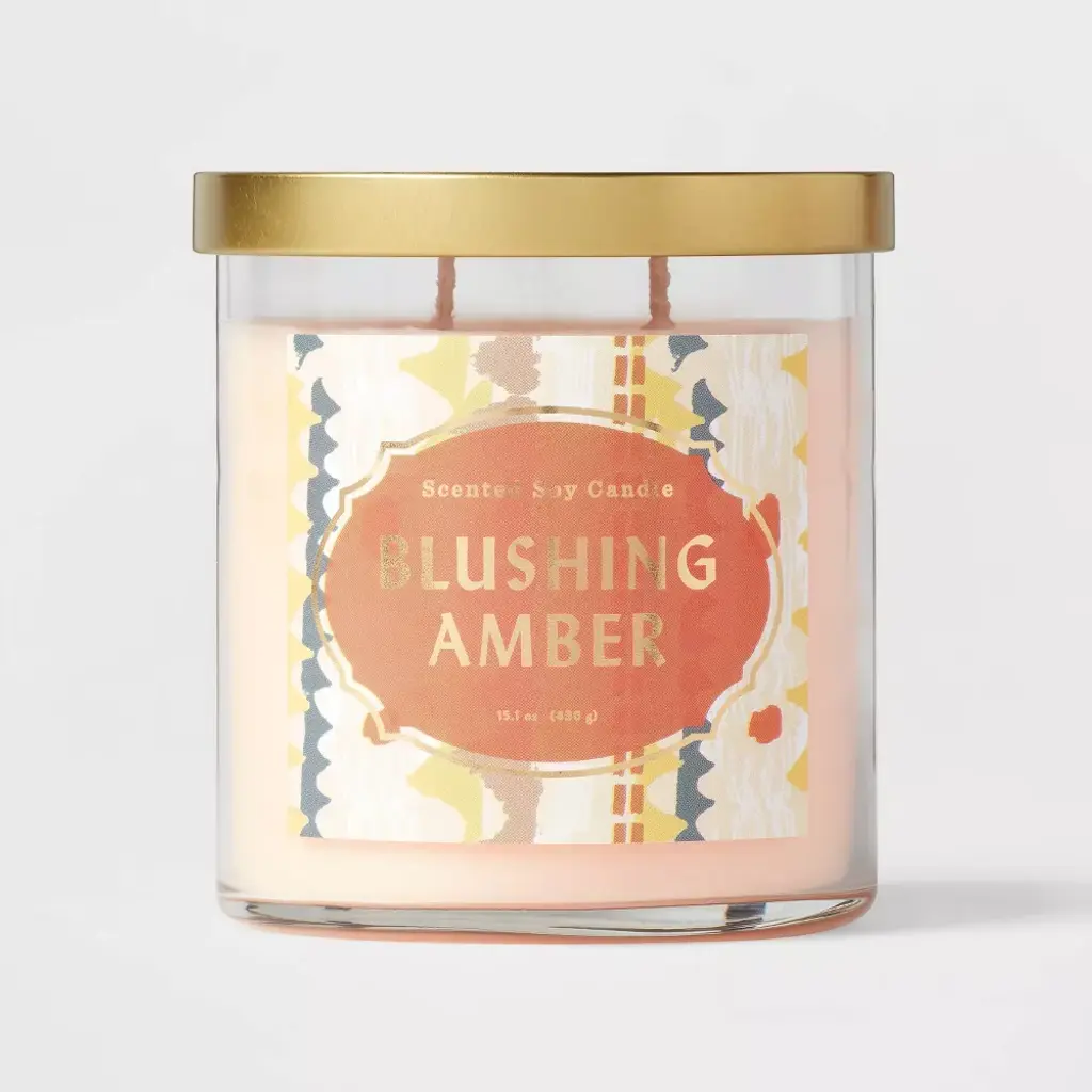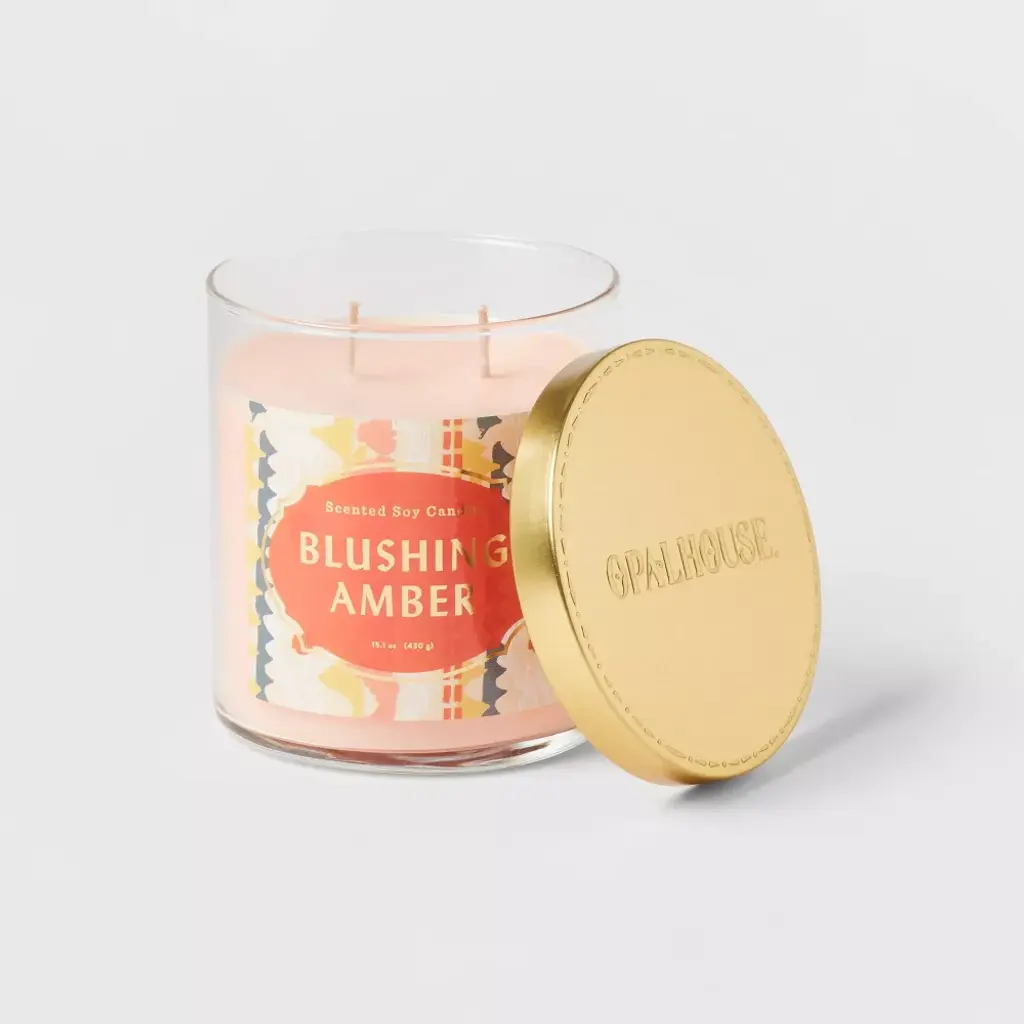 Enjoy a sweet and romantic atmosphere with Lidded Glass Jar Candle Blushing Amber by Opalhouse™. Crafted from soy wax, this candle has a special scent that blends the fiery warmth of amber and the sweet nectar of vanilla. Whether you're enjoying an evening for two or just wanting to relax at home, light this soothing blushing amber candle by Opalhouse™ for a heavenly scent that fills your space with warmth and coziness. Create spaces as bold as your spirit.