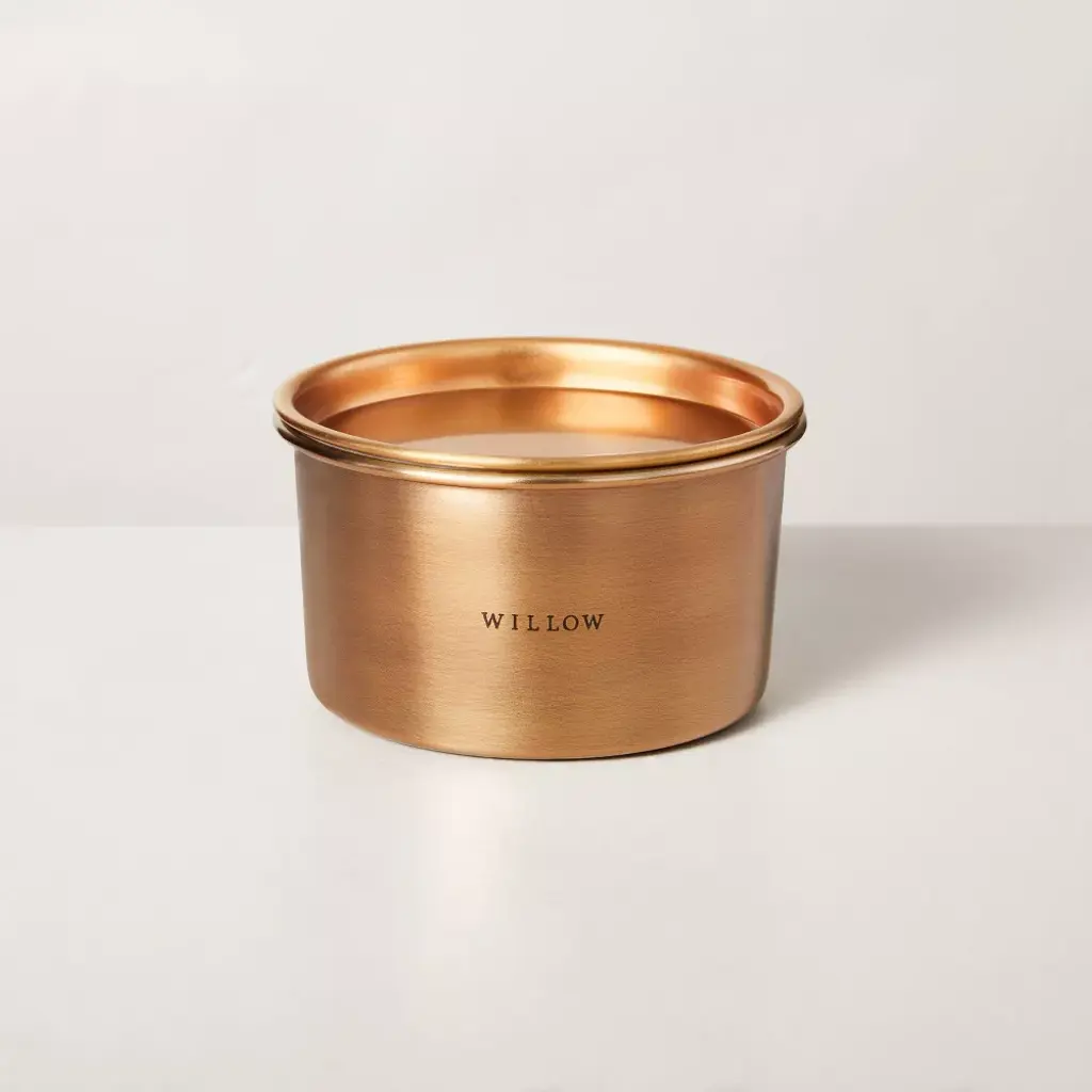 Bring the refreshing vibes of summer to your home with this Lidded Metal Willow 4-Wick Jar Candle with Brass Finish from Hearth & Hand™ with Magnolia. This metal jar candle features the refreshing perfume of citrus to transform your abode into an inviting oasis, and its four-wick design releases ample scent into your space. Set in a brass-finish metal jar with "Willow" engraved in the front, the multi-wick candle can provide up to 40 hours of warm glow, and the lid allows you to safely store it when not in use. Simply place this scented candle jar on any surface or countertop and enjoy the relaxing scents of citrus. Hearth & Hand™ with Magnolia: Gather ∙ Create ∙ Enjoy