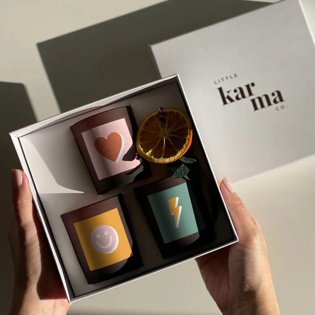 This beautiful candle gift set combines the luxury of boujee yet sustainable packaging with the fun, colourful designs of our refillable candles. Now in in a brand new, next-level sustainable mycelium gift box that fully biodegrades in just 45 days and feeds nutrients back into the soil.Our Alba scent is like receiving a beautiful bunch of flowers from a loved one. Juniper packs a punch with the strength of nature and evergreens. Let a wave of happiness wash over you as you de-stress with Luna's calming lavender aroma. These best selling scents are all handcrafted with our unique pure essential oil blends.Handcrafted using 100% natural wax and pure essential oils, these candles are vegan, clean and contain no nasties.