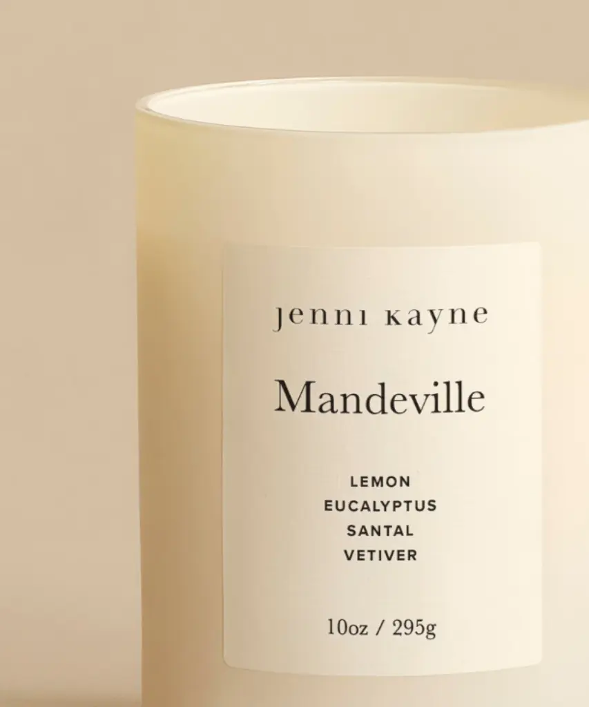 Mandeville Glass Candle Natural Inspired by the idyllic setting of Jenni's own home in Mandeville Canyon, this scent features notes of lemon, oak, eucalyptus, santal, and vetiver. Vessel and scent developed and hand-poured in Los Angeles. Wax is a natural blend of coconut, soy, apricot oil, and paraffin with a lead-free cotton wick. Burn Time: 50-70 hours To repurpose your glass candle vessel, simply remove the wick by adding a drop of boiling water, wait a few minutes and remove with pliers.