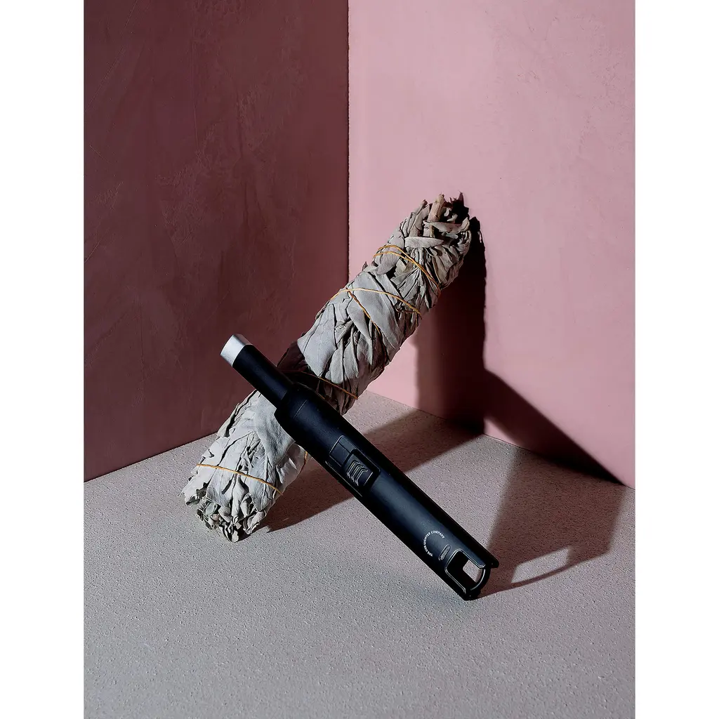 Sleek black USB candle lighter uses electrical energy instead of harmful butane gas to light candles indoors and out. Plug in to recharge. CB2 exclusive.