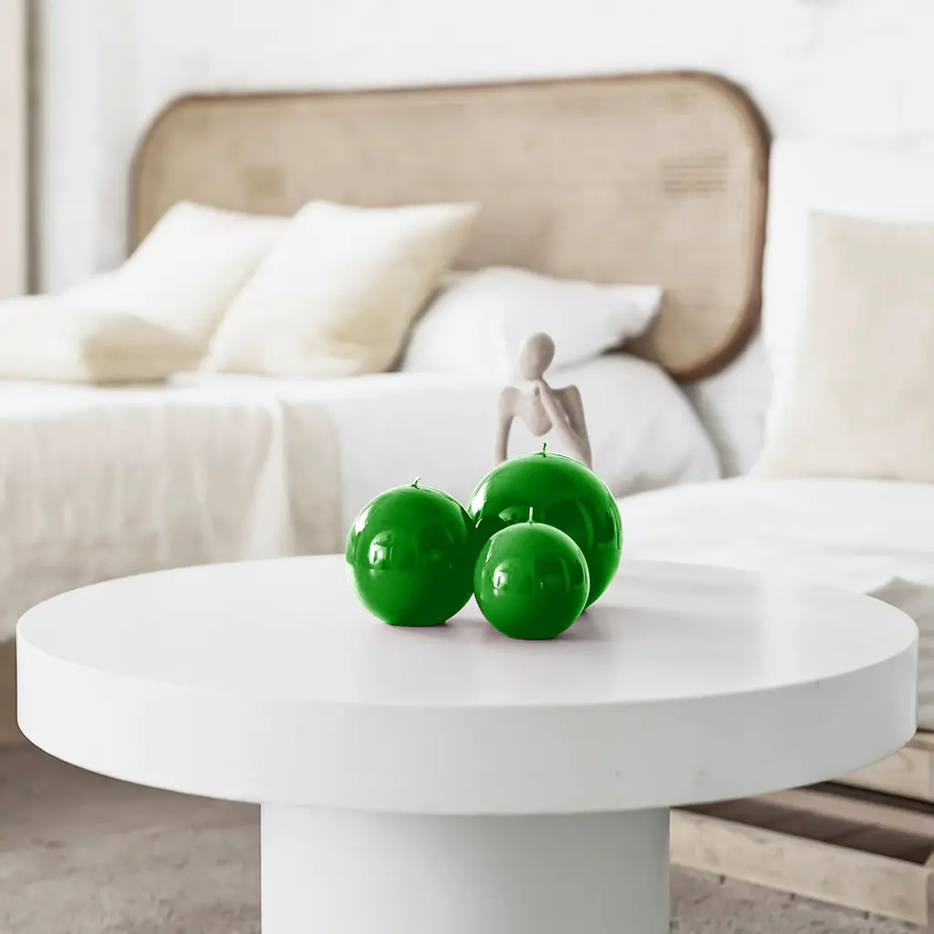 Vibrant like a lush garden during the summer months, this green round candle will add a pop of color to any room. The Meloria Green candle has an elegant design that offers a creative twist on classic pillar-like candles. Instead of rising in height, this Graziani candle features a spherical shape and a highly polished surface that makes the wax look like a glass globe. To achieve this distinct effect, artisans dip every candle in a special, cellulose-based coating and leave the candles to dry naturally. This week-long process ensures that every Meloria candle has a perfectly smooth and lustrous finish. Available in different sizes, this green round candle is ideal as a gift as it comes with a black velvet bag and a stylish gift box. Made in Italy. .