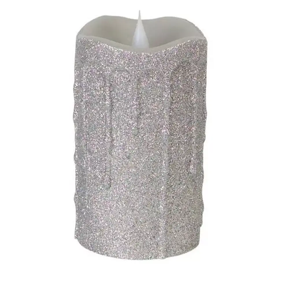 Versatile in its simplicity, this silver glittered, flameless wax, LED pillar candle is a perfect match for your festive decor. Illuminate your home with this piece that overwhelms with its lifelike beauty. Use this beautiful luminary to invigorate your holiday festivities. Product Features: Flameless candles give the warm, inviting glow of a fire without the actual danger of an open flame 360 degrees realistic, multi-hued moving flame Made from real wax, but lasts a lot longer than a traditional candle Remote control has 2/4/6/8 hour timer, adjustable dimmer and flicker flame options Requires 2 "C" size batteries (not included) For maximum performance use alkaline batteries Recommended for indoor use Dimensions: 5.25" high x 3" diameter Material(s): wax/PVC Note: Remote control is not included
