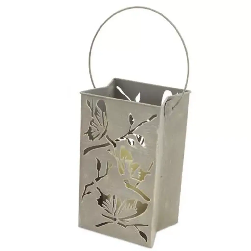 Gray brushed metal luminary features a cut-out butterfly motif Inside the luminary is a non-removable flameless LED candle Candle is illuminated by one amber flicker flame light Requires (2) "C" batteries (not included) Timer function allows you to choose 4 hour or 8 hour cycle times Attached metal hook for hanging or carrying Includes optional lawn stakes For indoor/outdoor use Dimensions: 9"H x 5.25"W x 4.25"D 14.5"H (including handle) Material(s): metal/plastic
