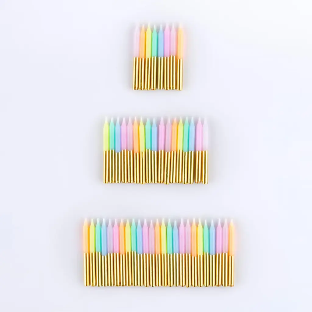 Dim the lights, a rainbow of colors is here! Add a burst of color and charm to any celebration cake or cupcakes with these cheerful pastel mini candles. With 6 pastel hues of violet, magenta, light pink, peach, yellow, mint, and shiny gold foil bases, they instantly brighten up any celebration, making them the perfect cake decorations. Designed to delight, these birthday cake candles are more than just functional, they're eye-catching cake toppers that create a joyful, whimsical atmosphere for the guest of honour and party pals. Place them all, or just a few, on the cake depending on the look you want to create.