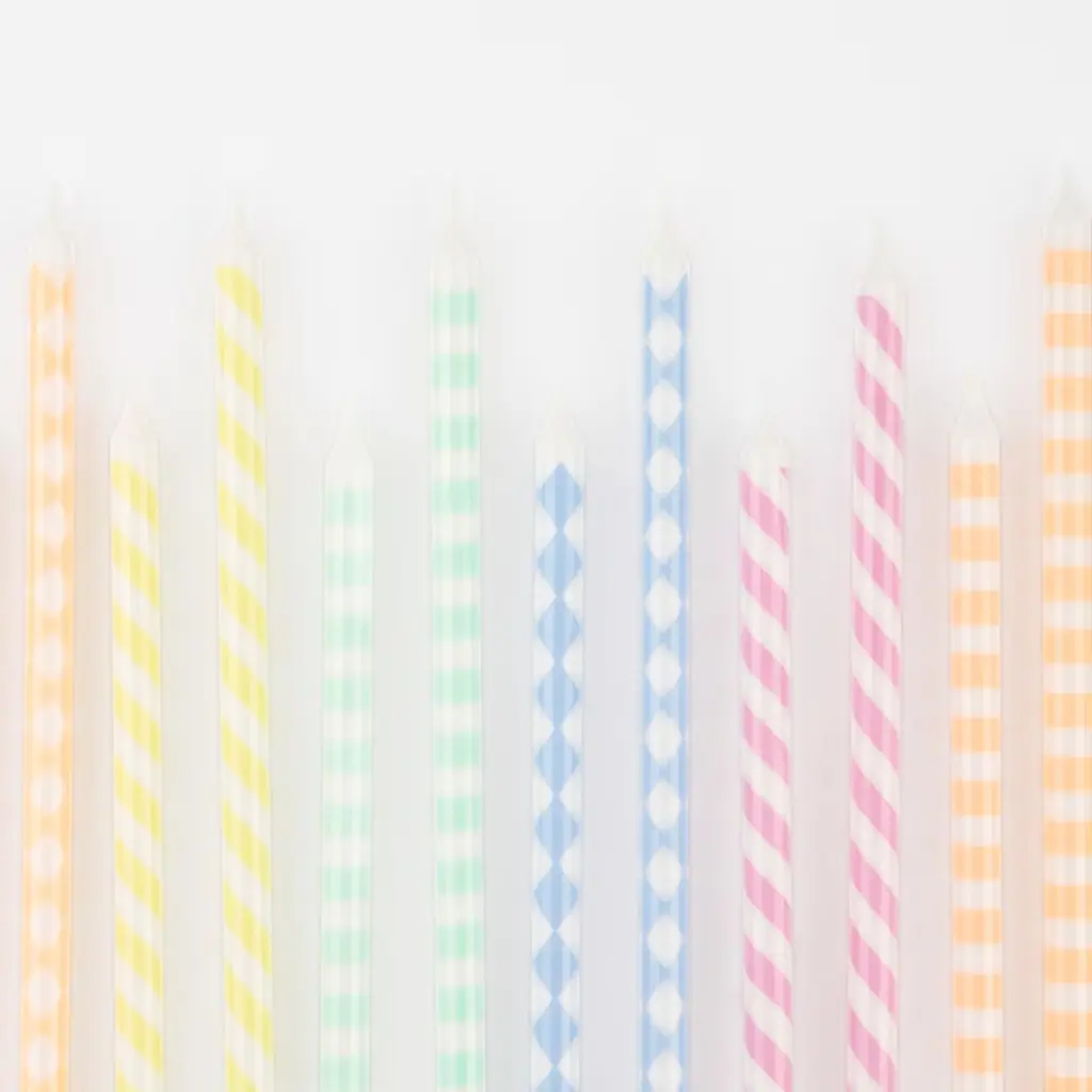 Create a magical moment at any celebration with this gorgeous set of pastel birthday candles, designed to bring a soft, stylish glow to your celebration cake. The set includes six beautifully co-ordinated shades, in pink, lilac, mint, lemon, peach, and blue, with 8 different designs including stripes and harlequin diamonds. These tall, elegant birthday cake candles are perfect for adding a delicate splash of color that feels both whimsical and refined. Whether you're planning a sweet pastel birthday party, a baby shower, or simply want to elevate any cake, these pastel candles are the finishing touch that ties it all together.
