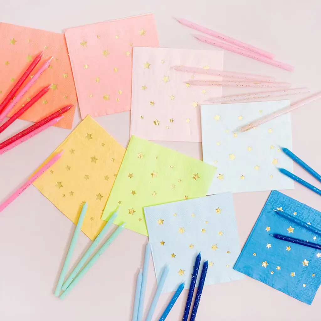 Unwrapping presents, cake, blowing out candles... Some things never lose their appeal, no matter how many birthdays pass you by, so why not add a little extra touch of color to your party with this set of twenty-four pink candles, in a range of six shades from ice to magenta, all decorated with gold glitter