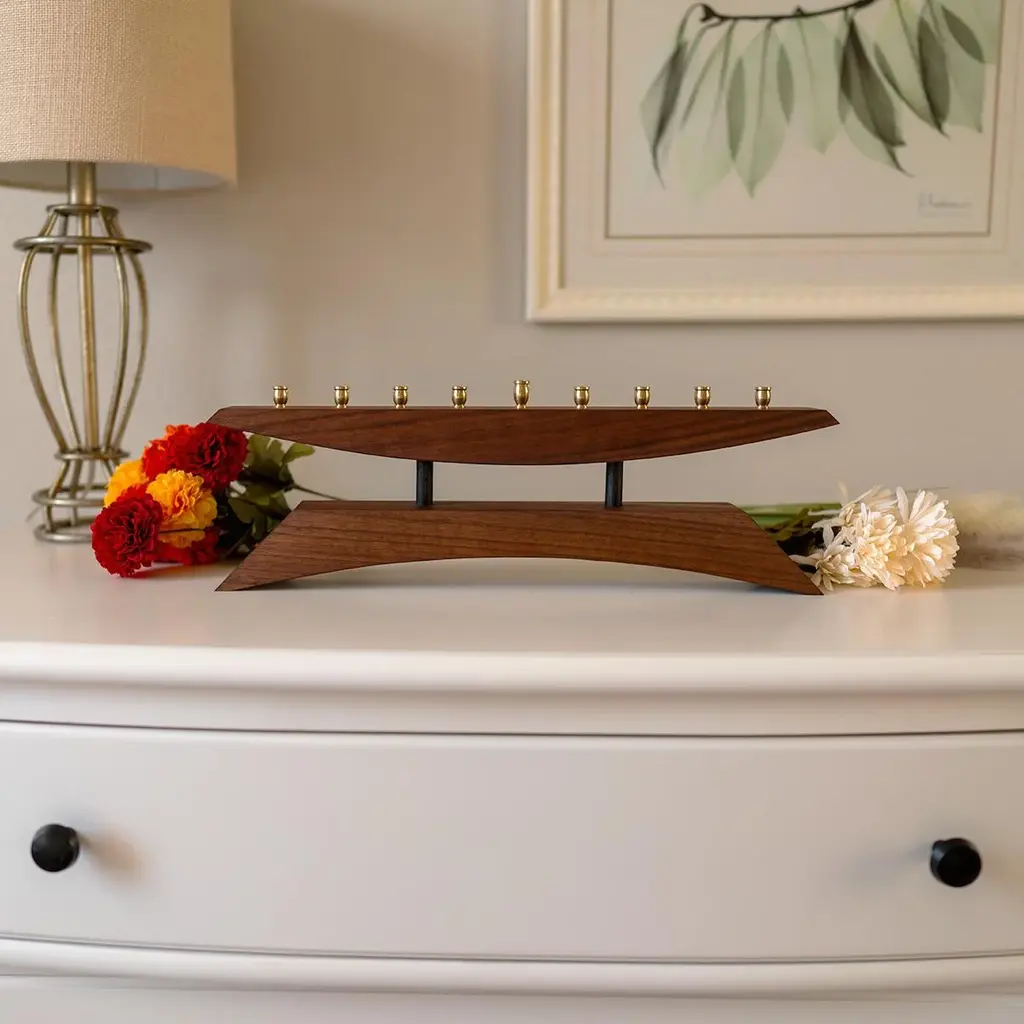East of the Sun – Mid-Century Modern Walnut & Brass Menorah Let the Festival of Lights shine a little brighter with “East of the Sun,” a sculptural menorah handcrafted from American walnut and hand-polished brass. Inspired by the optimistic spirit and timeless lines of mid-century modern design, this piece is more than a ritual object—it’s a work of art meant to be cherished for generations. Each menorah begins with a single piece of solid walnut, carefully selected for its rich grain and character. The form is bold yet understated, a silhouette that feels both architectural and organic—rooted in tradition, yet unapologetically modern. Nine brass candle cups gleam atop the walnut base, catching and reflecting candlelight with a warm, inviting glow. Whether displayed on a holiday table, credenza, or mantel, “East of the Sun” brings a quiet sense of ceremony to any space. Its minimalist design makes it as fitting for everyday display as it is for Hanukkah, an heirloom to be passed down, a statement to be admired. Hand-finished with natural oil and wax for a touchable, satin feel, every detail speaks to care, craft, and a reverence for materials. Each menorah is signed and made one at a time in our family workshop, ensuring no two are exactly alike. Details: • Solid American walnut, hand-finished • Brass candle cups (fits standard Hanukkah candles) • Approx. 18" x 6" x 2" • Signed by the maker • Ships securely and ready to gift Gift “East of the Sun” to mark a milestone, celebrate a wedding, or begin a new family tradition. This is Hanukkah reimagined: modern, meaningful, and made with heart.