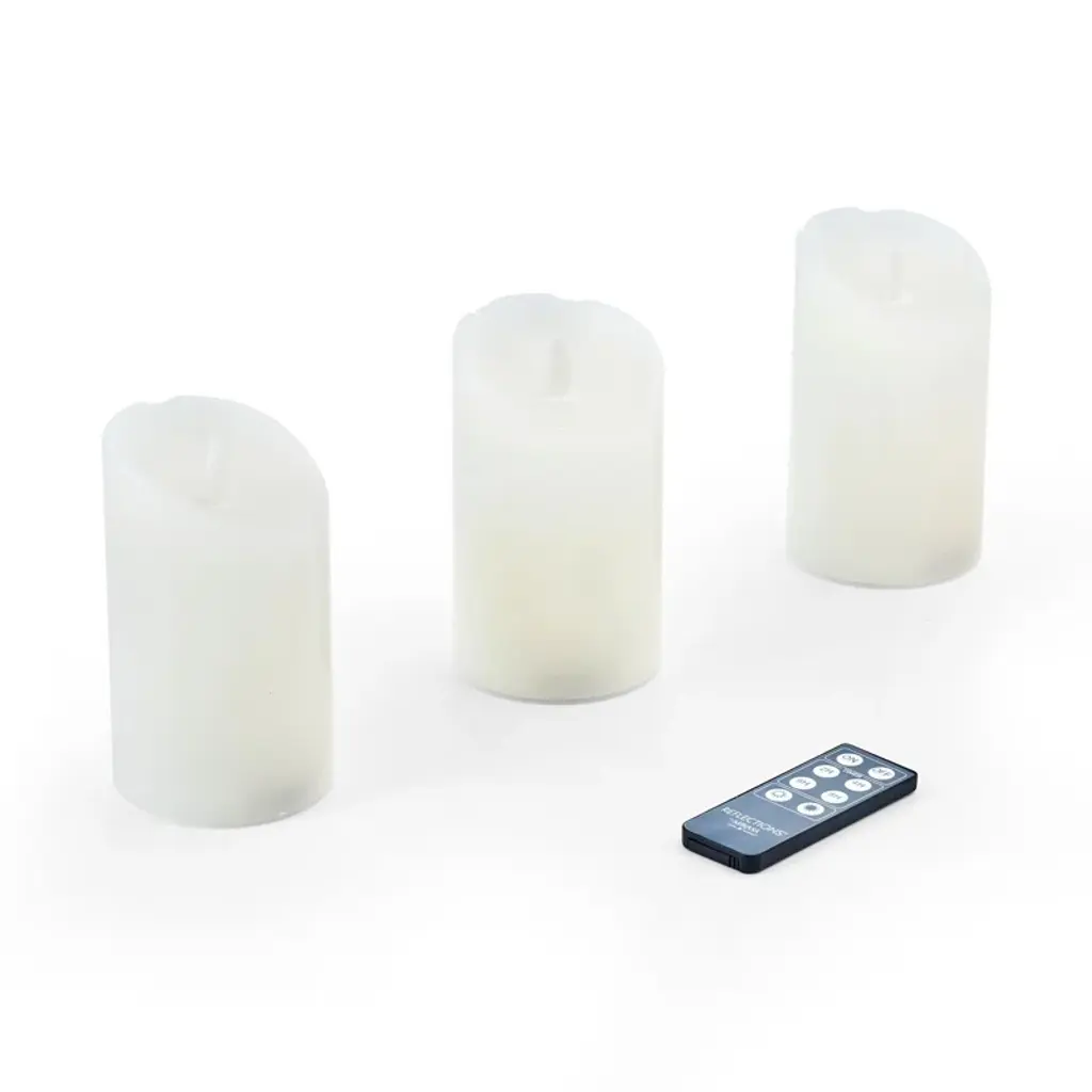 Elevate your home's ambiance with this set of three flameless pillar candles, designed to bring a warm, inviting glow without the worry of open flames. Made from realistic wax, these candles offer a flickering flame effect that mimics the real deal. They're battery-powered and come with a handy remote, so you can easily control the mood from anywhere in the room. Ideal for creating a cozy atmosphere, these candles are a safe and stylish addition to any space. Just remember, they're for indoor use only, so keep them away from the elements.