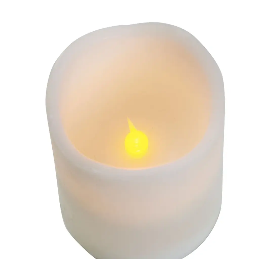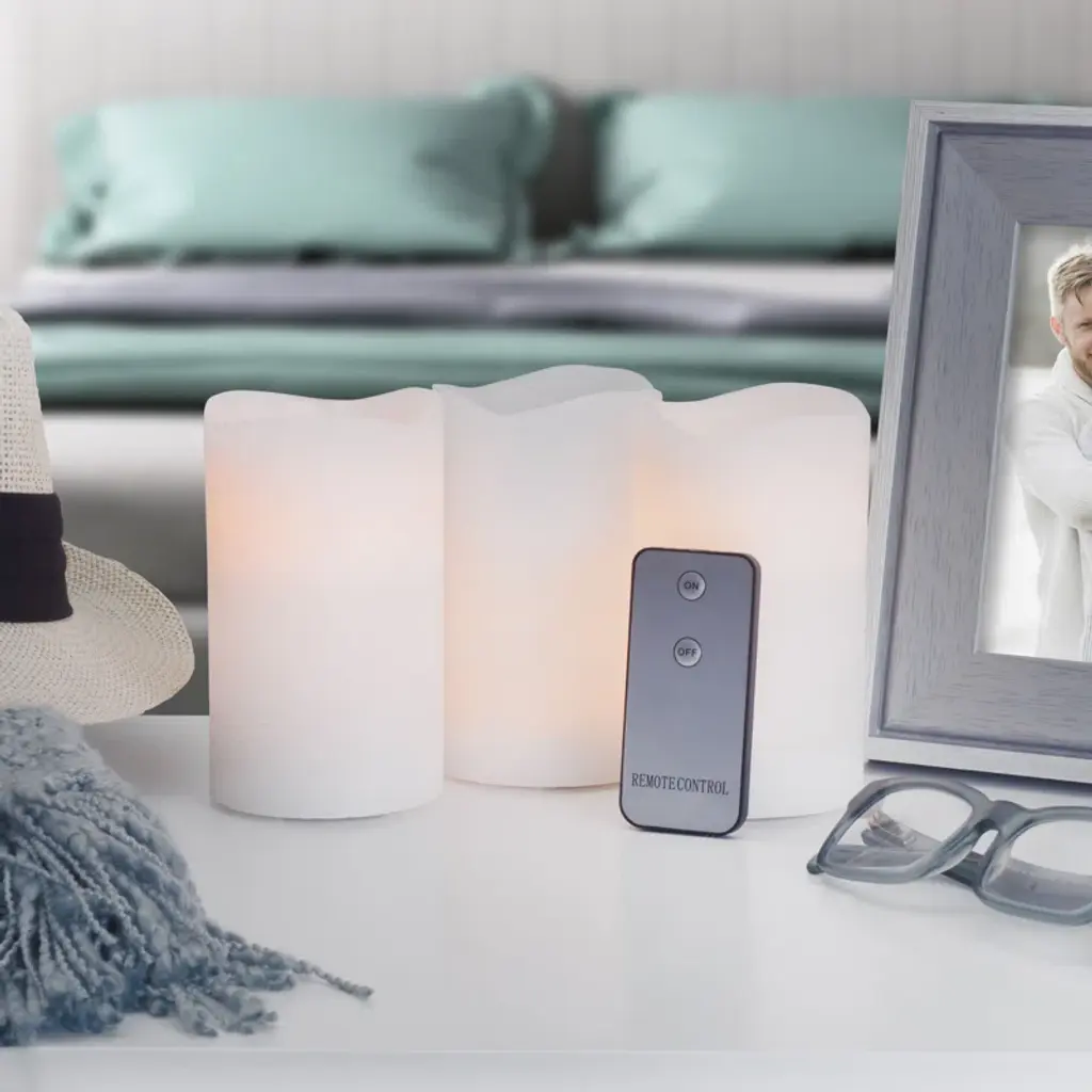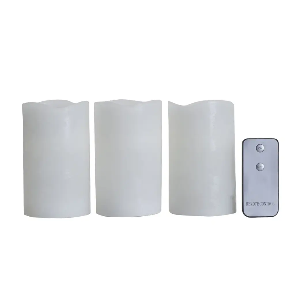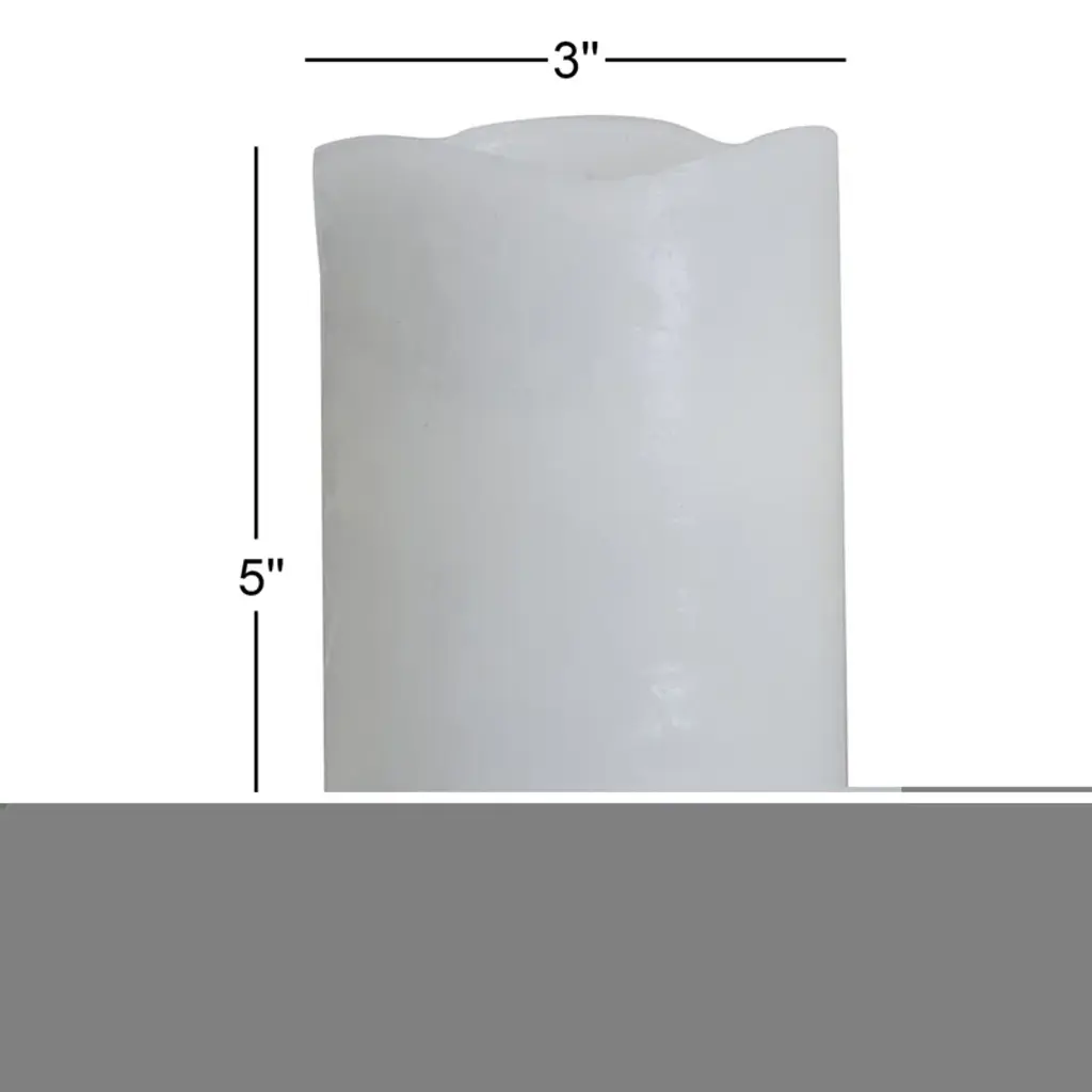 This Mikasa Set of 3 White LED Wax Pillar Candles brings the ambience of candlelight to your living space without the worries of a real flame or dripping wax. Made of real wax with wavy rims and a flickering light for an authentic look, these pillar candles can be used on their own or to safely illuminate seasonal arrangements. Candles feature a convenient on/off function. Each candle requires 2 AA batteries (not included). Set of 3 candles, each measuring 5-inches tall and 3 inches in diameter.