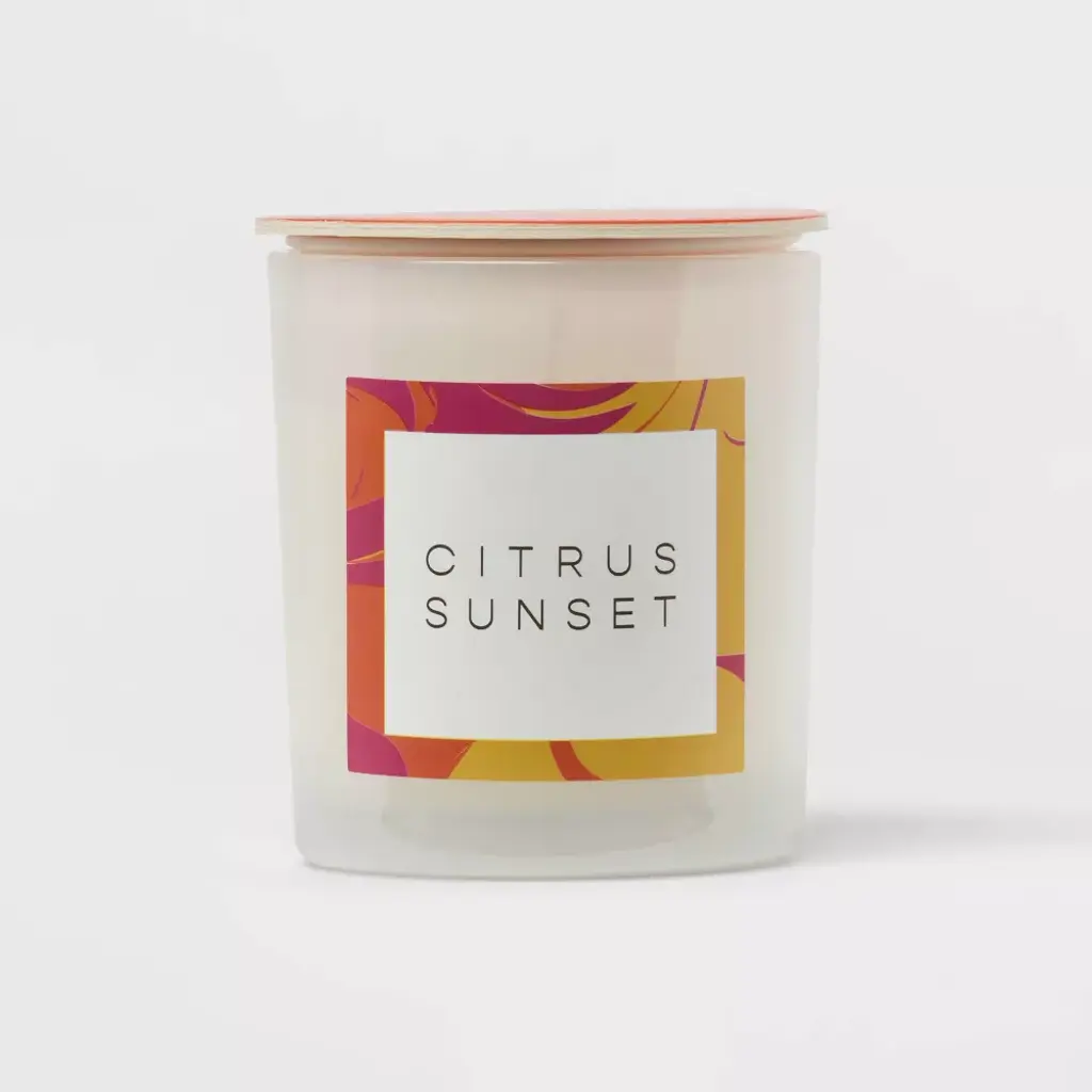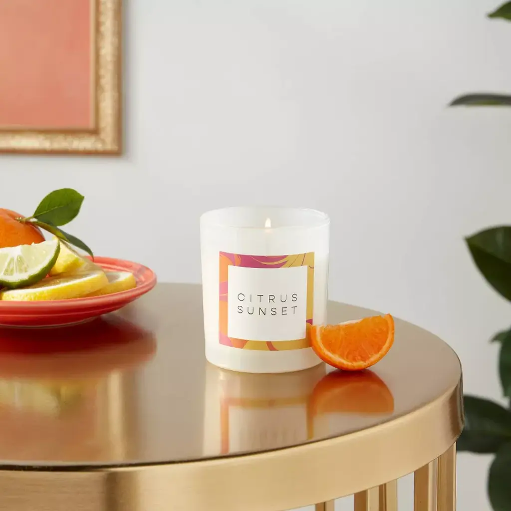 Envelope your home with refreshing aromas of the Milky Glass Jar Candle Citrus Sunset by Opalhouse™. This citrus sunset candle brings a zesty, fresh fragrance to your home. Perfect for adding a touch of summer and sunlight, it is made up of multiple scent notes that create an airy and uplifting atmosphere. Whether you’re seeking a delightfully zesty pick-me-up or just wanting to brighten up your space, the citrus sunset candle by Opalhouse™ is the perfect pick. Create spaces as bold as your spirit.