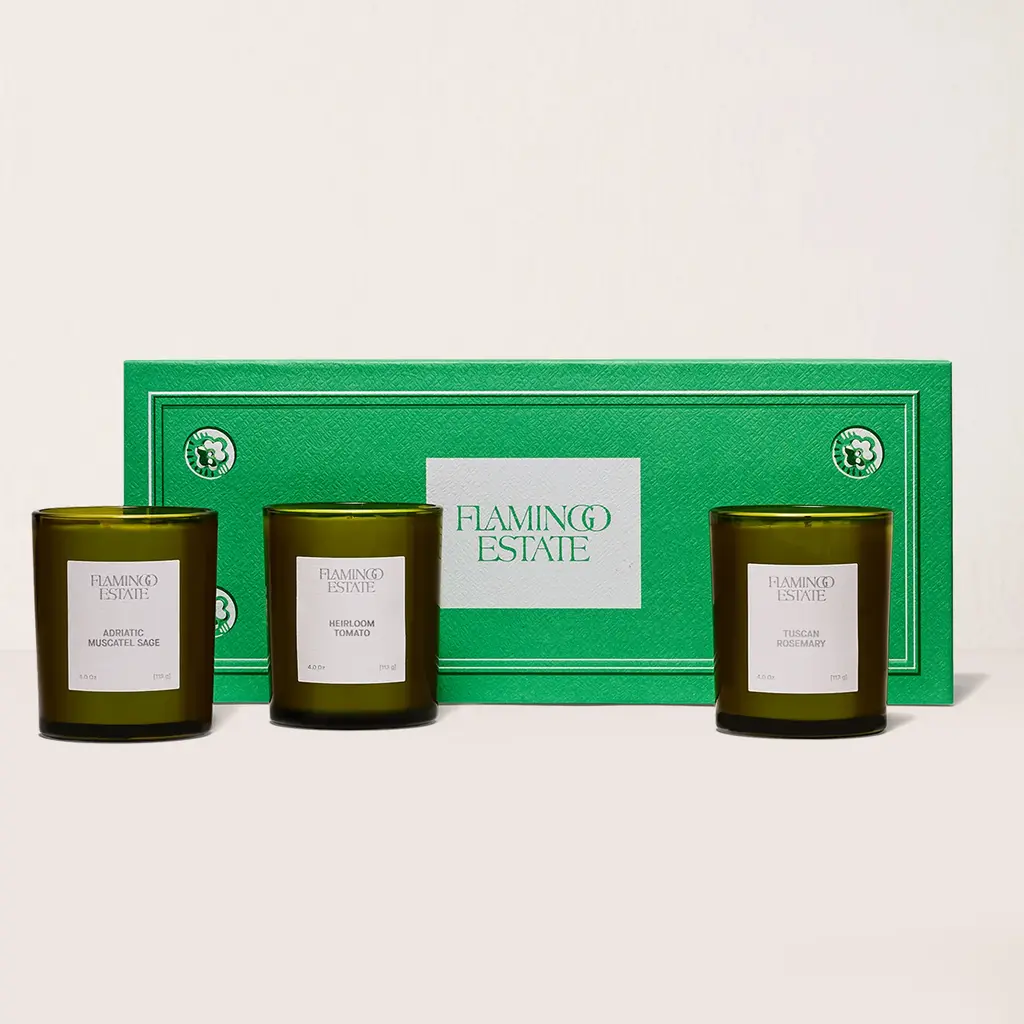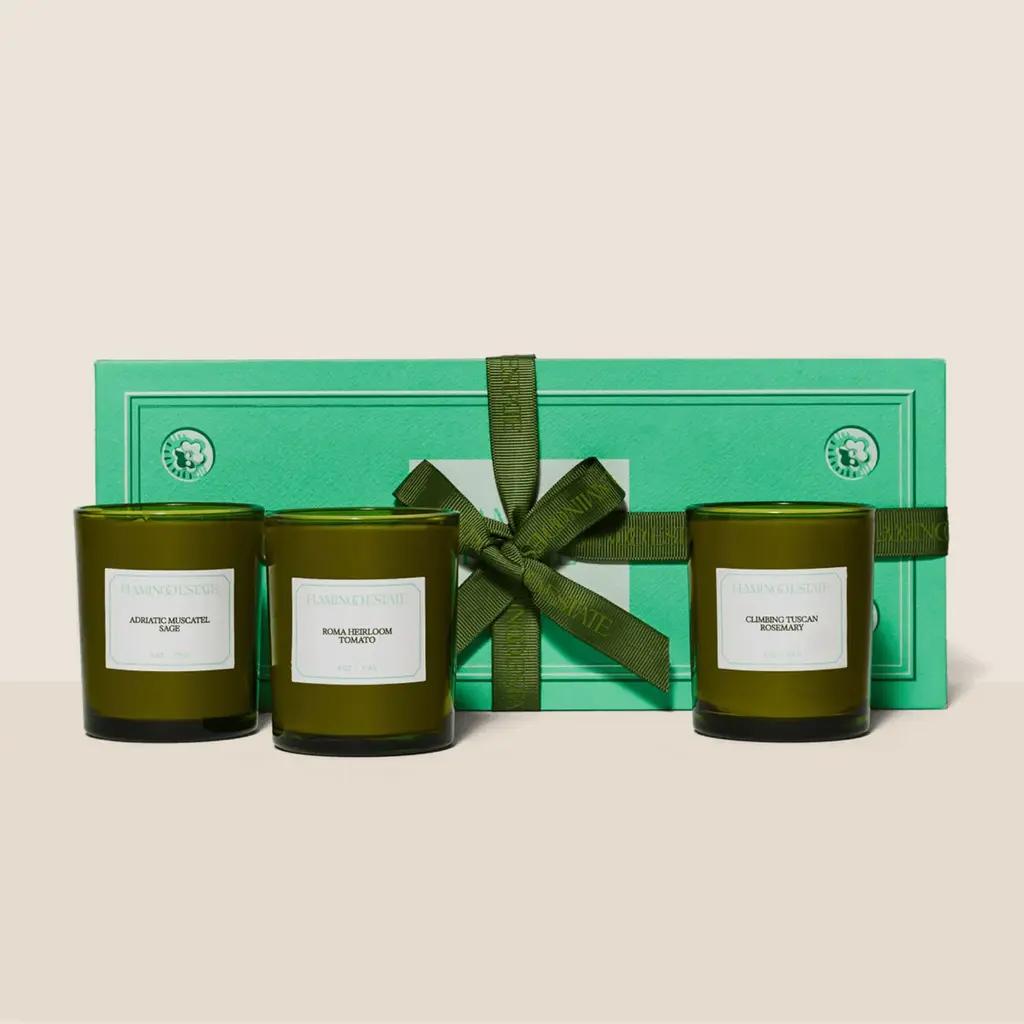 Our three most iconic scents — Tomato, Rosemary, and Sage — captured in petite glass vessels. These candles are our origin story, inspired by the fragrant pathways of the garden. Light them together to create ambiance, gift them, or sample our signature scents. A fête of light awaits. Inside This Set Mini Heirloom Tomato CandleOur signature scent — a bold, green aroma of freshly crushed Tomato leaves, like a kiss from Mother Nature.Mini Tuscan Rosemary CandleA warm, herbaceous blend of camphor and wood that fills the room with earthy freshness, like air from an open window.Mini Adriatic Muscatel Sage CandleSacred and transportive, with notes of salt-kissed breezes and deep garden earthiness. *This Gift Set comes in an embossed Gift Box, finished with a grosgrain bow.