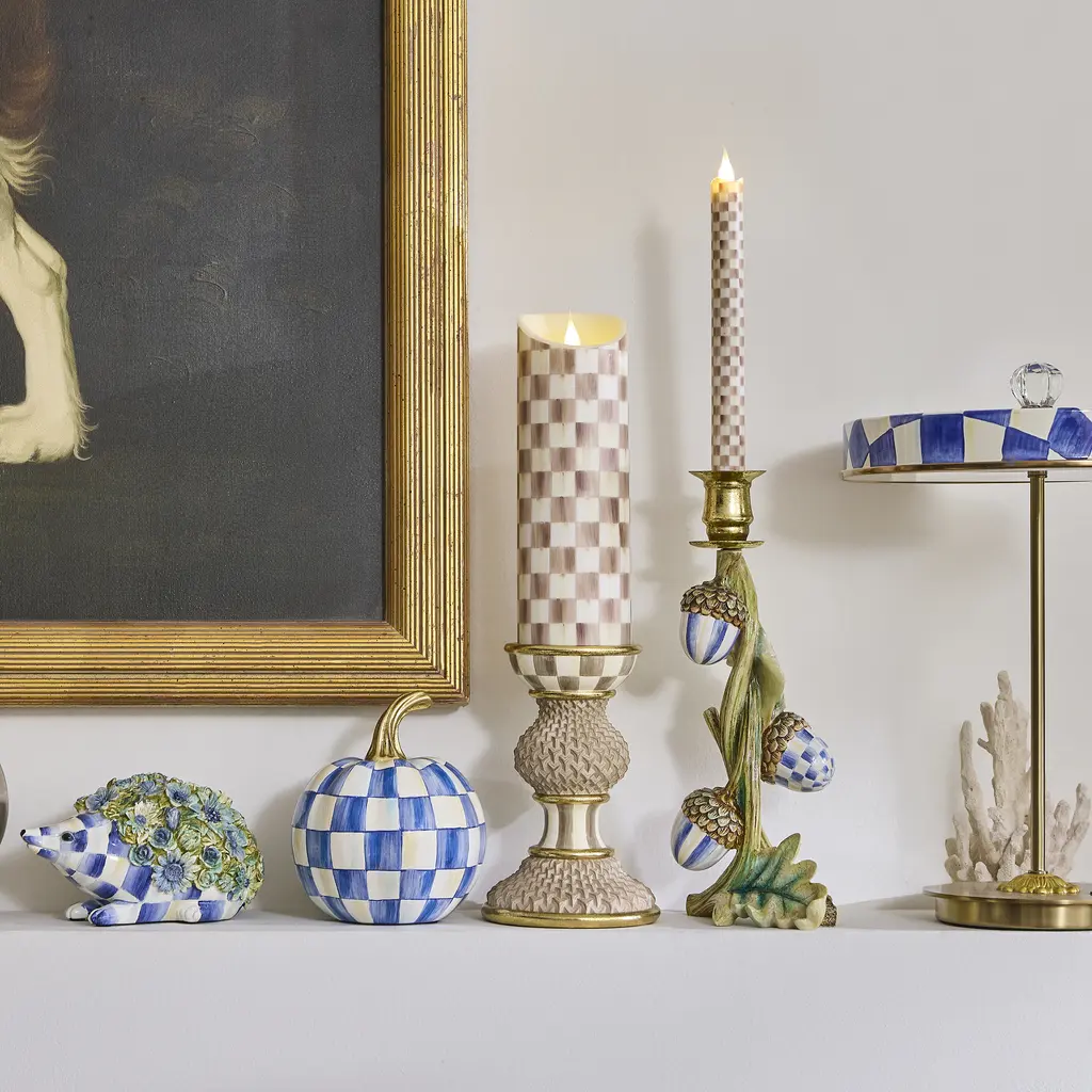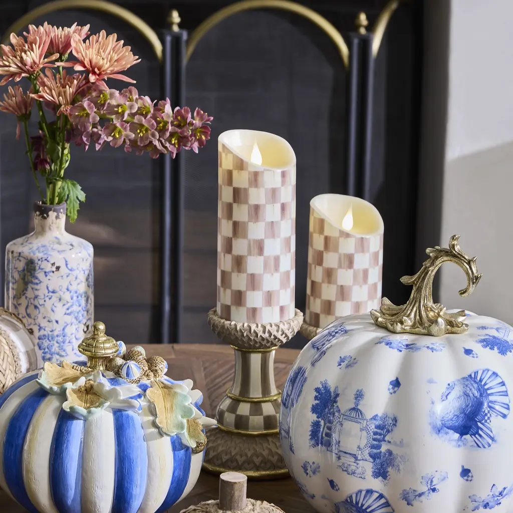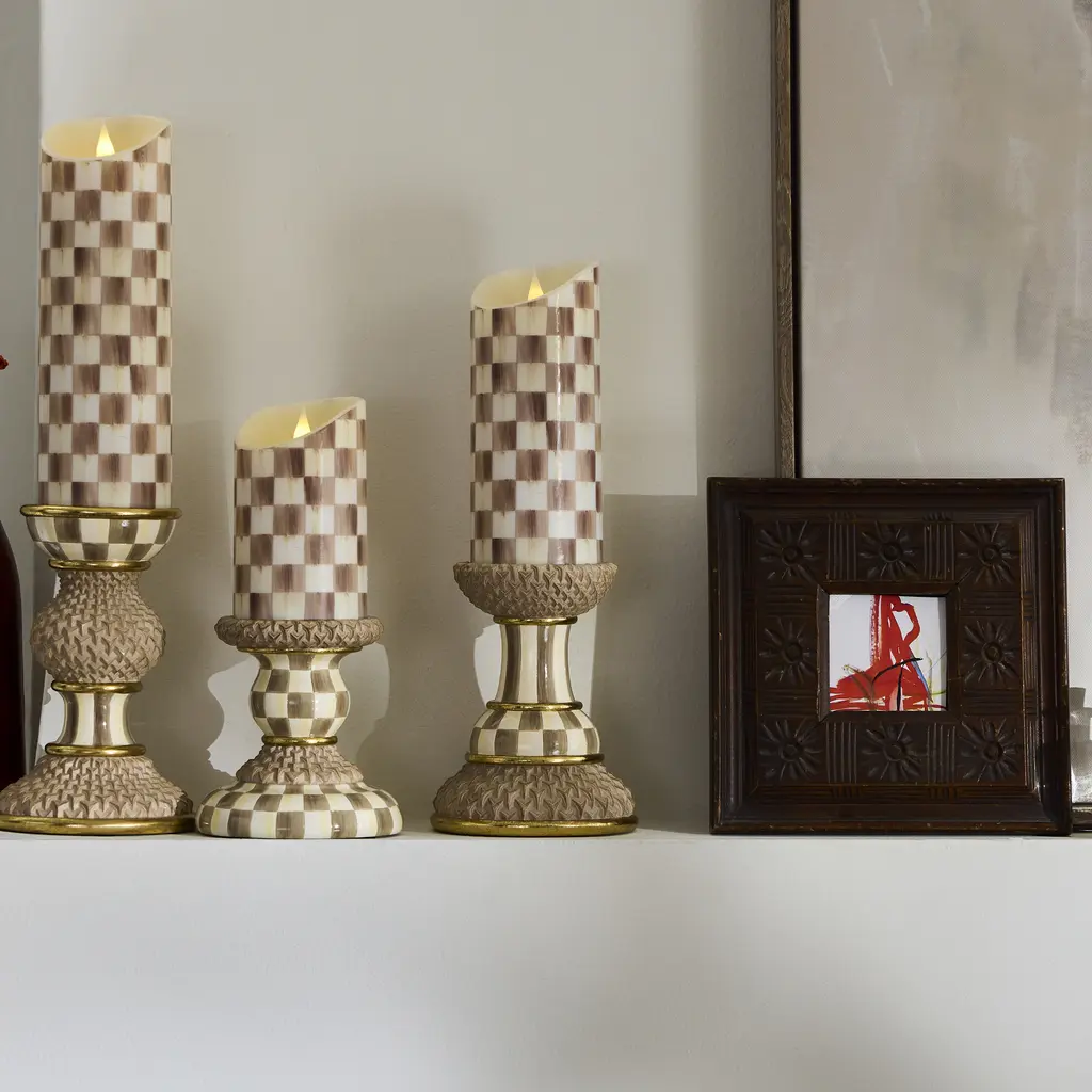 Every celebration can glow with MacKenzie-Childs style with our Mocha Check Flameless 7" Pillar Candle. Decorated with our espresso-inspired check, it features the look of a wax candle but casts a flameless glow created with two AA batteries. The light can be set on a five-hour timer with an included remote control.