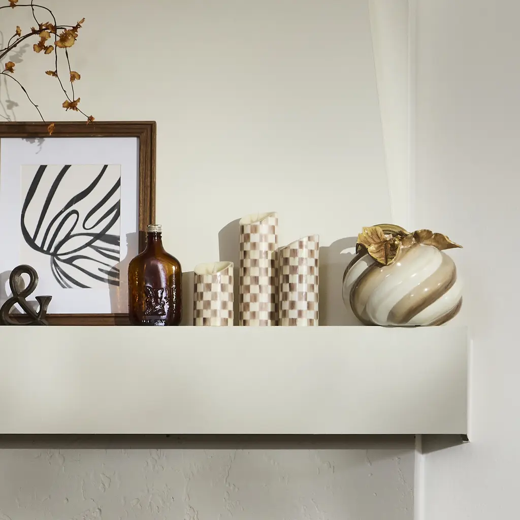 Every celebration can glow with MacKenzie-Childs style with our Mocha Check Flameless 9" Pillar Candle. Decorated with our espresso-inspired check, it features the look of a wax candle but casts a flameless glow created with two AA batteries. The light can be set on a five-hour timer with an included remote control.