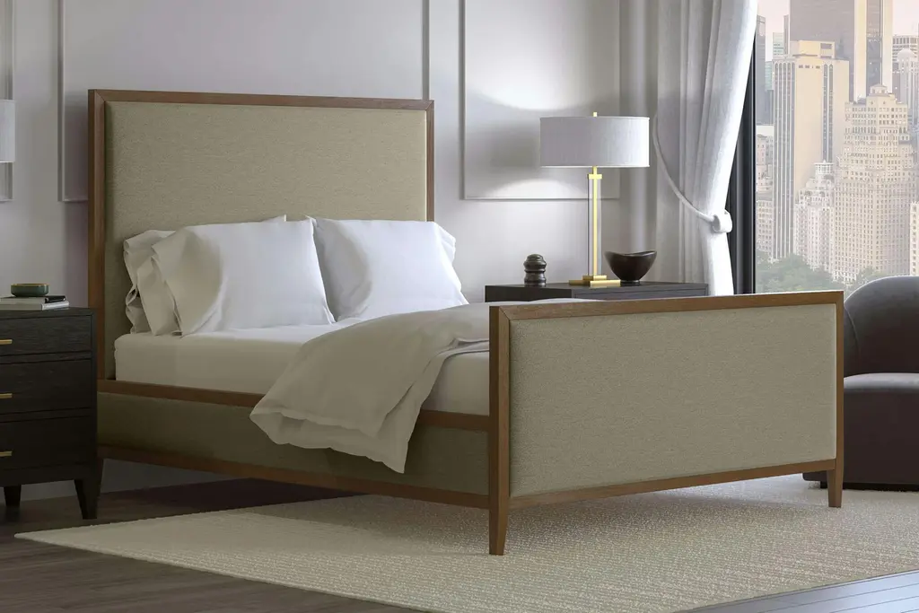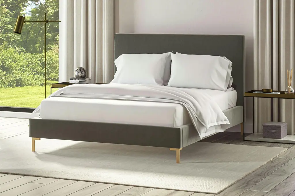 Accelerate your bedroom decor with the Virginia Platform Bed. Made with a solid wood frame upholstered in polyester fabric, Virginia features tapered wood legs, plastic foot glides, stylish headboard, and ten sturdy wood slats with a centered supporting bar and two support legs for enhanced stability. Due to the wooden slat support system, the use of a box spring is unnecessary. Virginia supports memory foam mattresses such as our Aveline series. Perfect for mid-century modern, minimalist and contemporary bedrooms. Mattress not included. Assembly required.