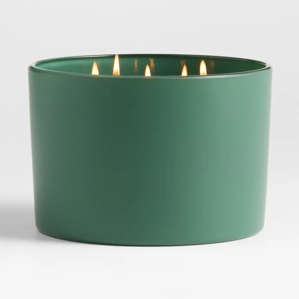 Utterly modern in monochromatic green. Our five-wick candle infuses the air with the invigorating scents of eucalyptus, spearmint, fir balsam and winter citrus. Packaged in a green gift box, the matte green glass vessel filled with green wax lends a contemporary look to a coffee table, dresser or mantel. Part of our exclusive Monochrome scent collection, the No. 03 Evergreen candle is a Crate & Barrel exclusive.