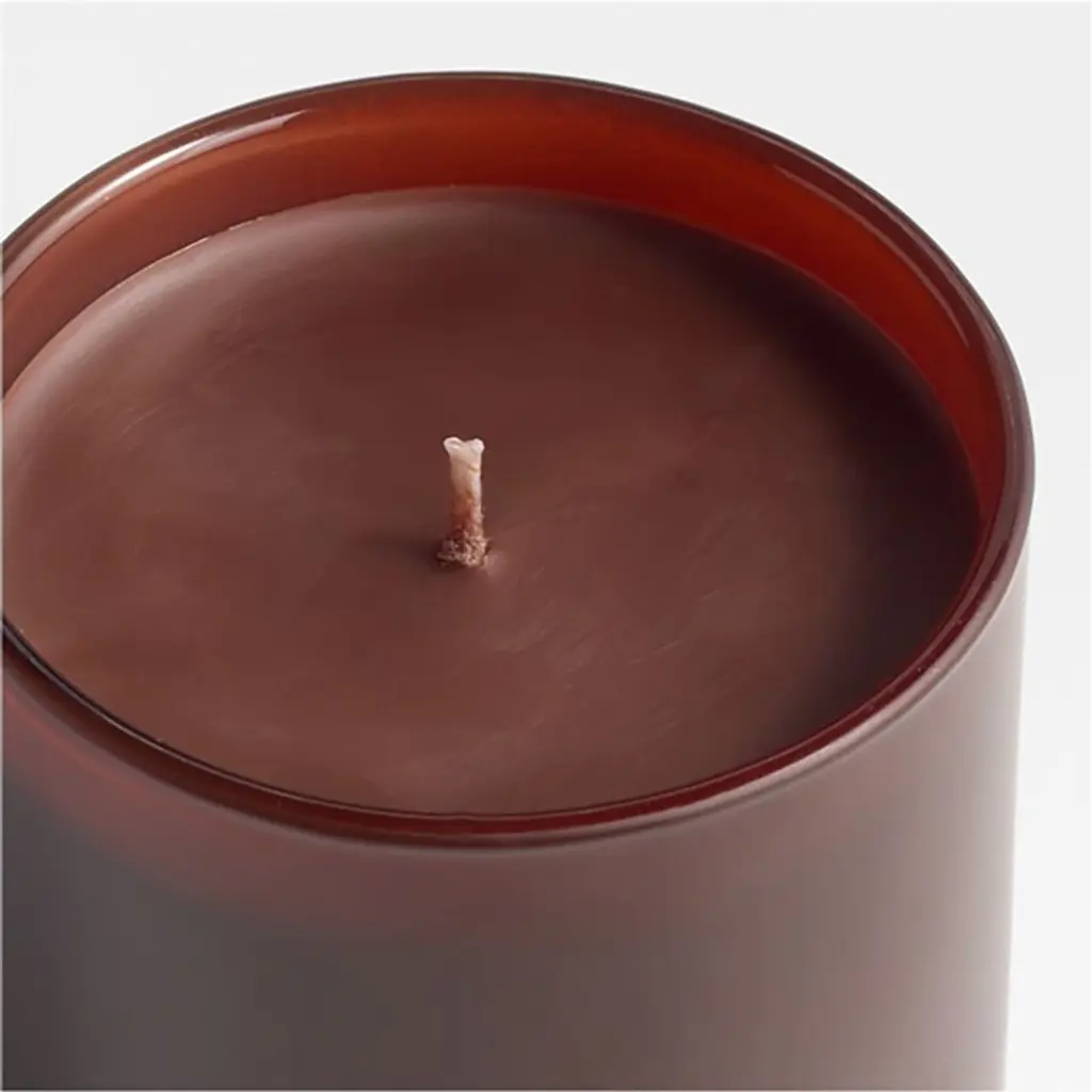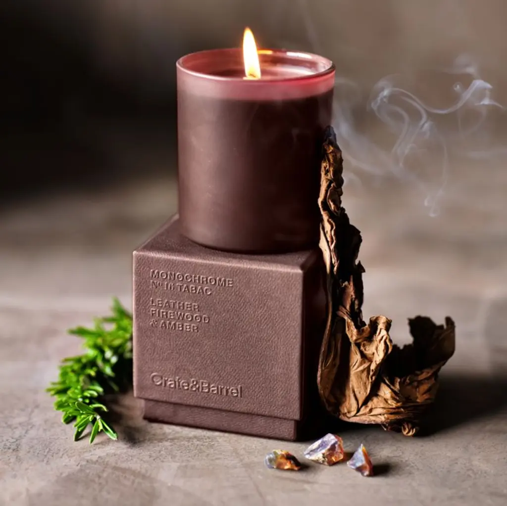 Utterly modern in monochromatic brown. Our Tabac candle infuses the air with the invigorating scents of pine, rosemary, cedar and bergamot grounded by the rich earthiness of patchouli, amber and leather. Packaged in a chocolate brown gift box, the matching glass vessel filled with wax in the same hue has a clean, sculptural look that stands out on a coffee table, dresser or mantel. Part of our exclusive Monochrome scent collection, the No. 16 Firewood candle is a Crate & Barrel exclusive.