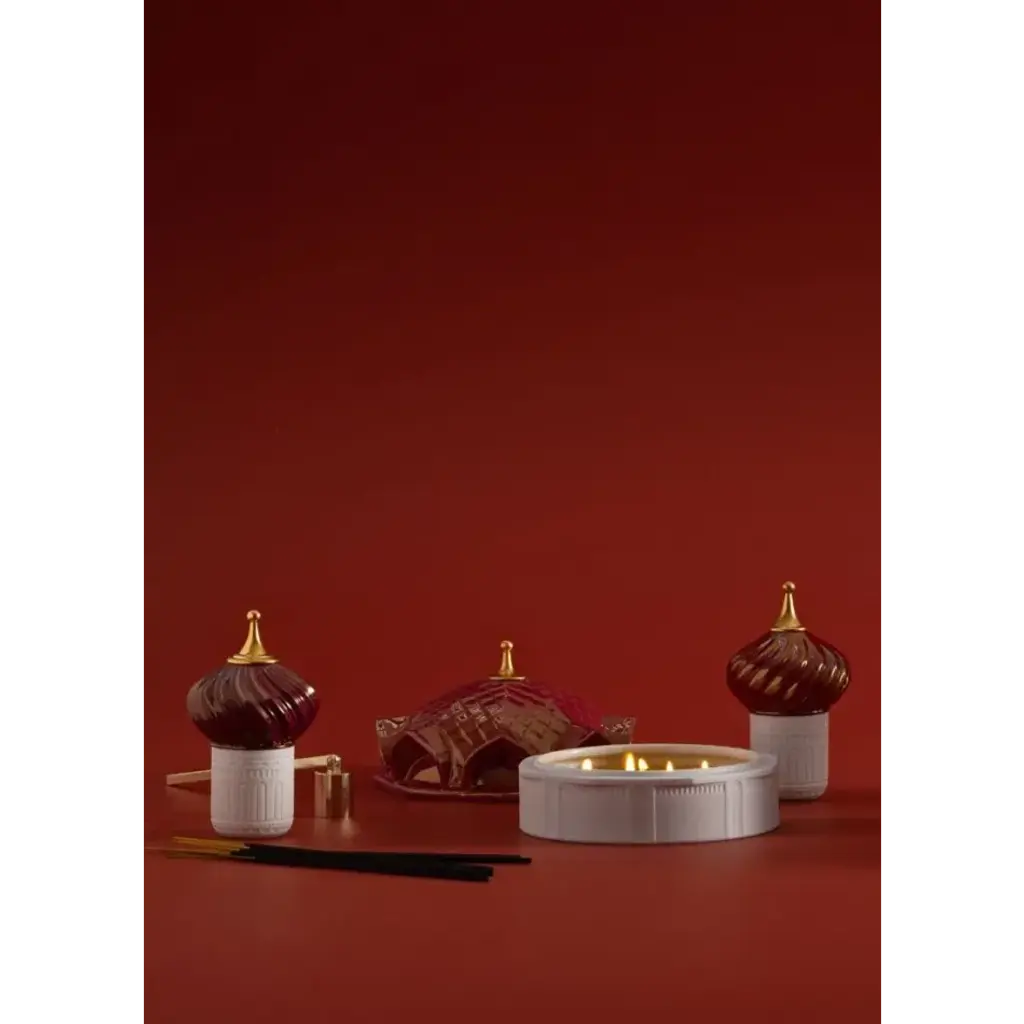 Candle for the home, designed in the shape of a tower, with a translucent porcelain container and red and gold lustre cover. Its scent carries such special ingredients such as cassis, lotus flower and frankincense. An iconic Spanish brand, Lladro is a world leader in the creation of porcelain art. Started by brothers Juan, Jose and Vicente Lladro in 1953, the ceramic figurines were initially inspired by the works of great European manufacturers like Meissen and Sevres. Over time, a unique style was forged, consisting of elongated lines, a revolutionary single-firing method, and soft pastel tones.