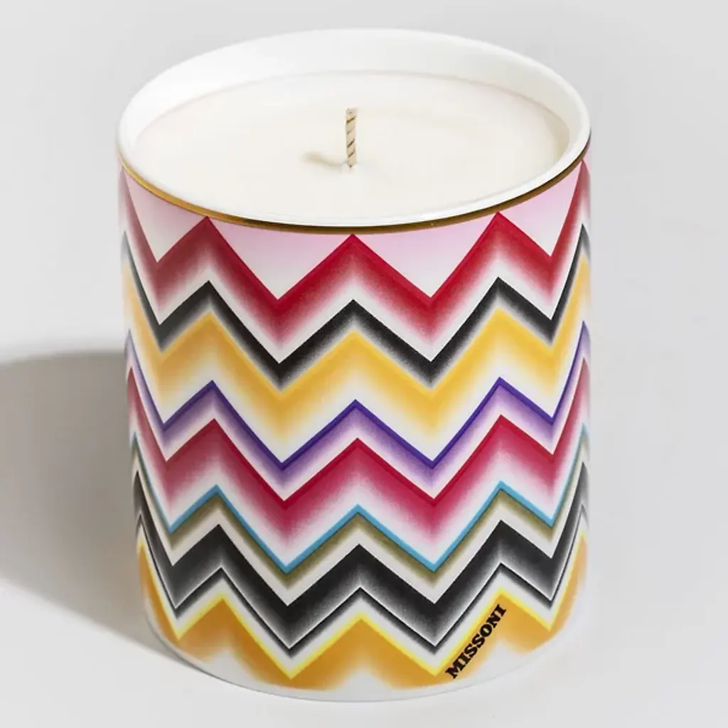 The Nastri Scented Candle from Missoni fills any space with a rich, layered fragrance while serving as a decorative accent. Housed in a glass vessel wrapped in flowing ribbon-like patterns, it blends scent and style effortlessly. With a 50-hour burn time, it opens with notes of clove, rosemary, and black pepper, followed by cinnamon, jasmine, patchouli, and cedarwood, finishing with vanilla, amber, tobacco, and violet leaves. Once the candle has burned down completely, the dishwasher-safe container transforms into a stylish storage piece for everyday essentials.