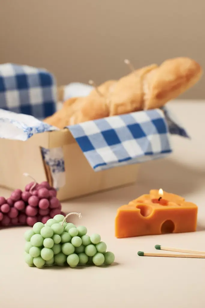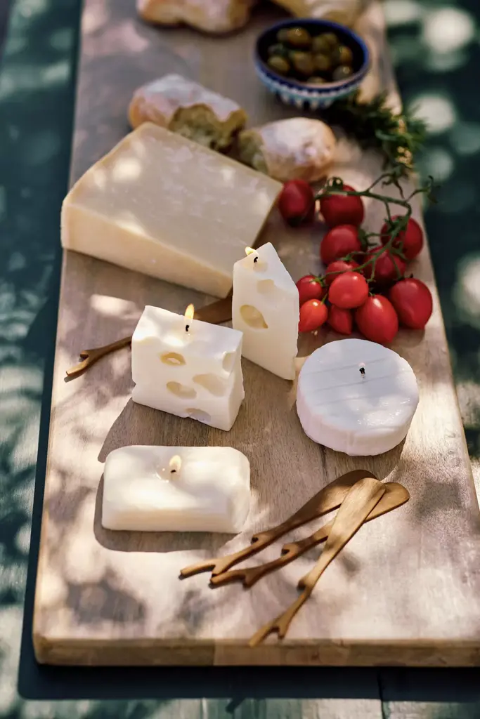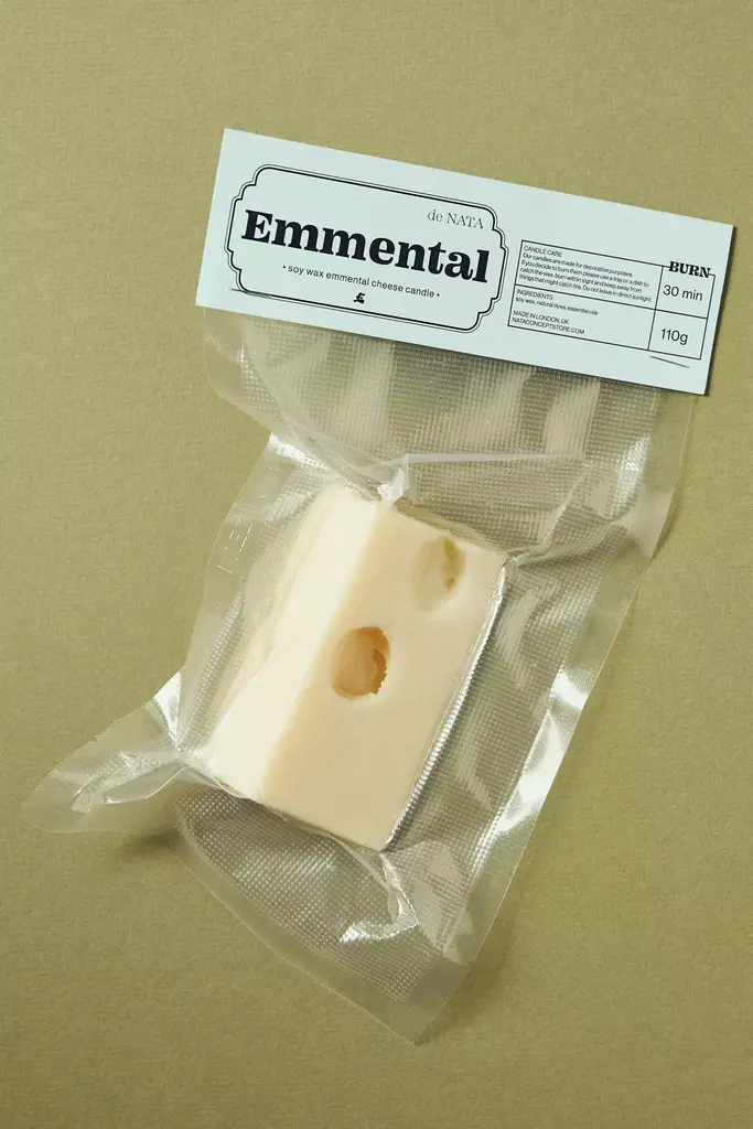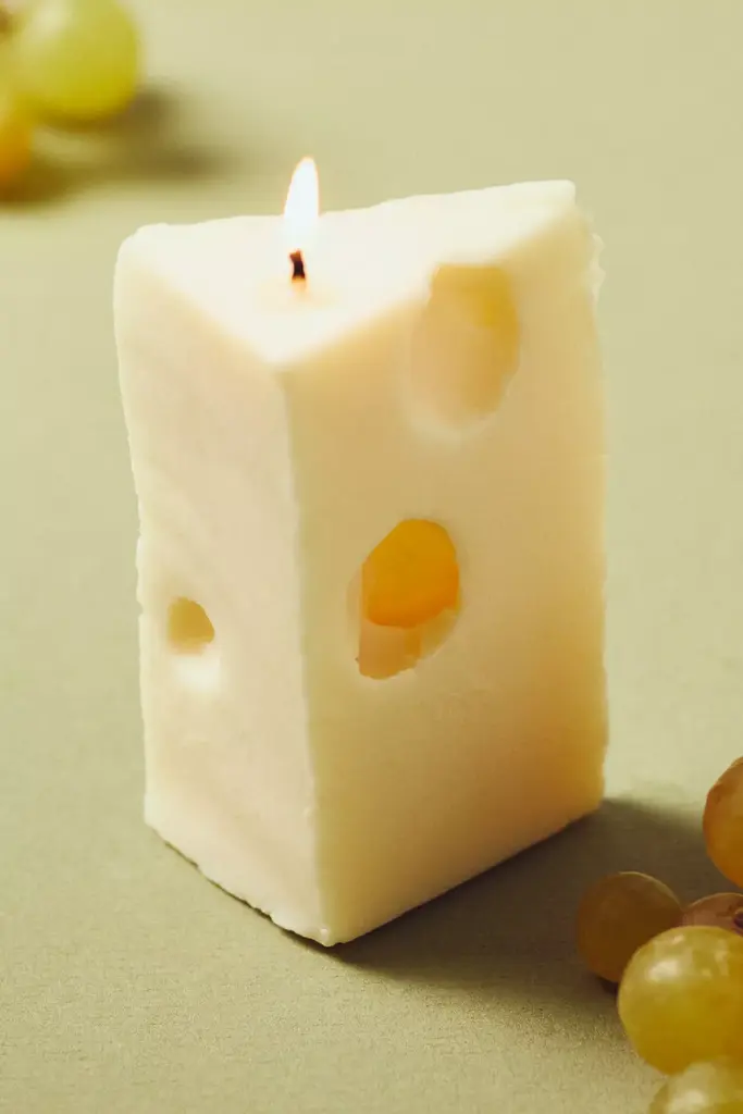 Smooth, firm, and instantly recognizable for its iconic holes, the Emmental Candle pays homage to the classic Swiss cheese often paired with Gruyre. Its just like the real deal except you cant eat it! This candle is made for decorative purposes. If you decide to burn it, please use a tray or a dish to catch the wax. Always burn within sight and keep away from things that can catch fire. Please do not leave your candle in direct sunlight. *For the best burn experience, keep the following in mind:* * The first time you light your candle, allow it to burn until the wax pool melts all the way to the edge; for a larger candle, this may take several hours. Wax has "memory," so if it is extinguished with a partial pool, that will prevent a full, even pool from forming in the future. * Trim your wick each time you light the candle, removing any "bloom" from the previous burn. We recommend lighting a wick that is 1/4-1/2" in length. * Ensure that your candle is placed on a heat-safe surface. * Do not allow wick trimmings, dust, or other materials to accumulate in the wax pool. * To ensure safety and longevity, be sure to check the bottom of your candle for additional instructions, including details on when to discontinue use.